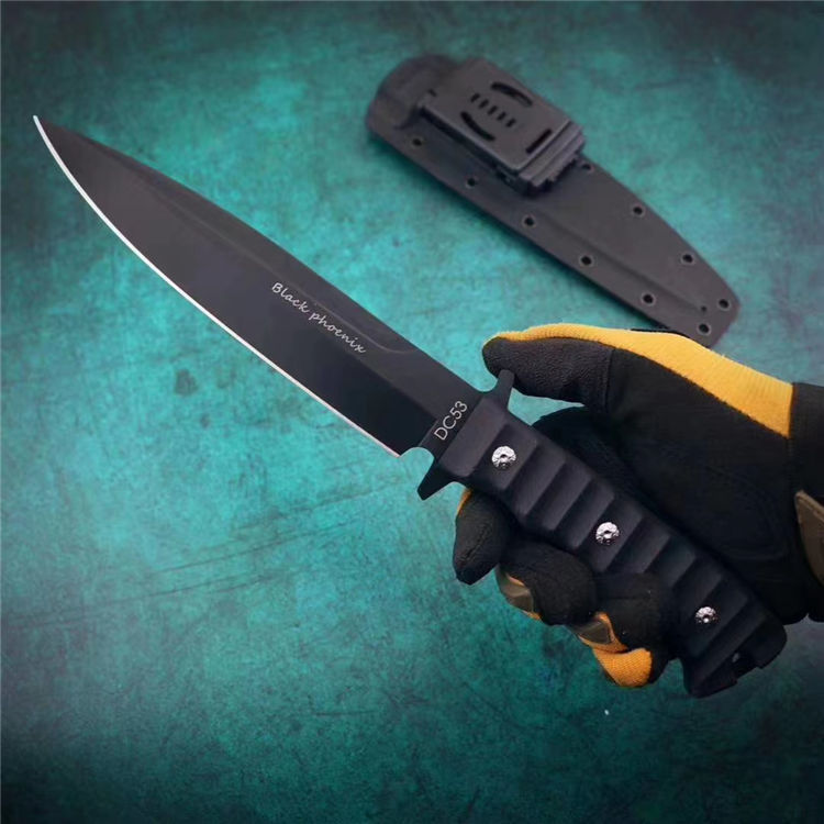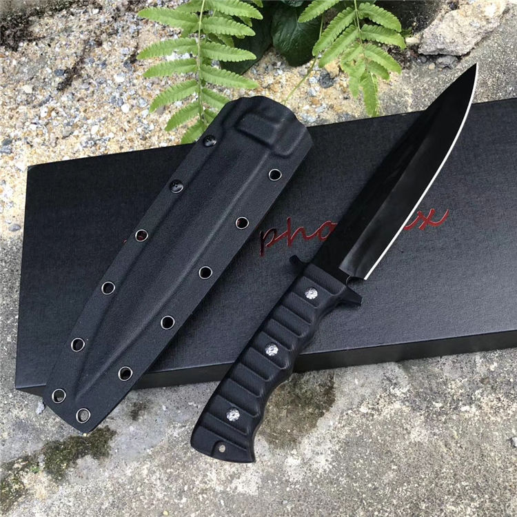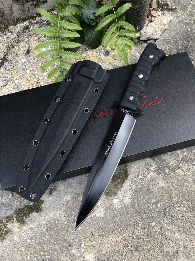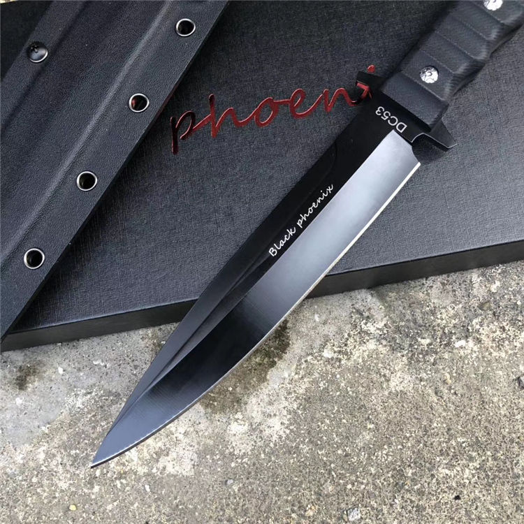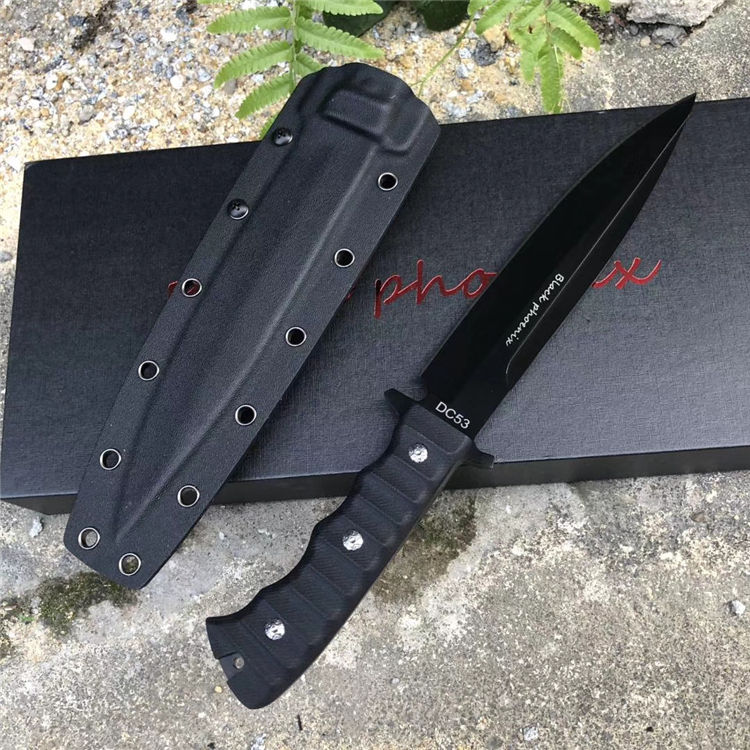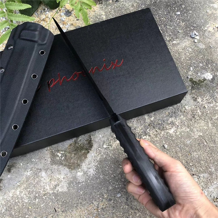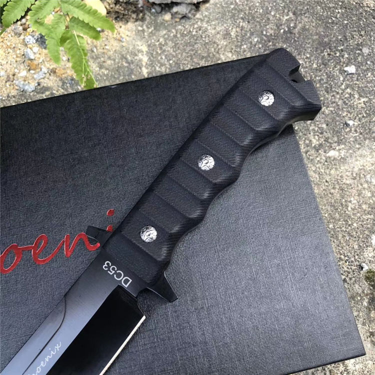 俄罗斯黑版凤凰Black直刀 全长:33cm 刃宽:3.5cm 厚度:6mm 刃长:19cm 刃材:DC53 刀重:410克(不含鞘) 硬度:60HRC(真空深冷处理) 手柄:CNC雕刻进口G10材料 刀鞘:美国进口Kydex板材