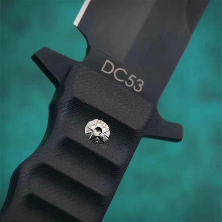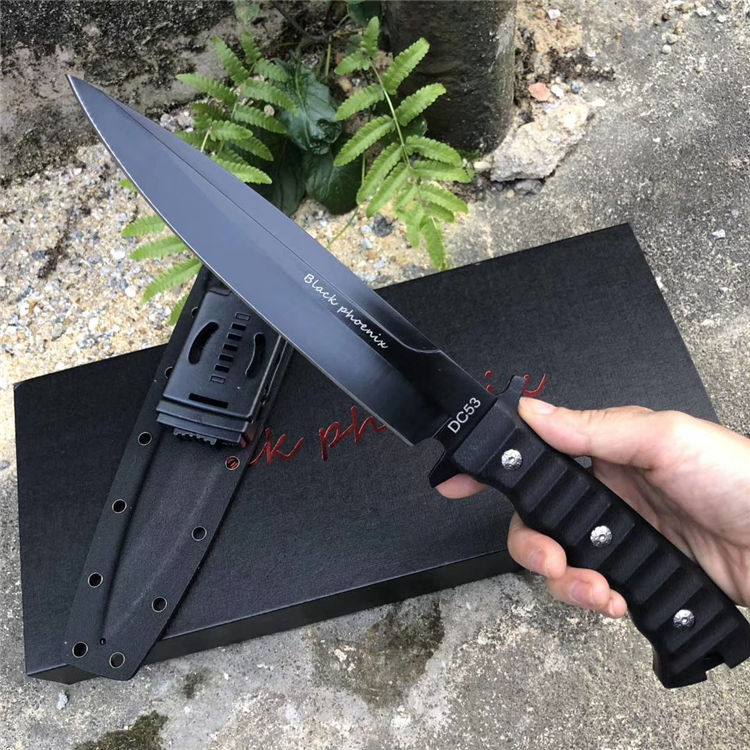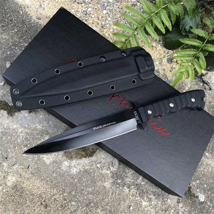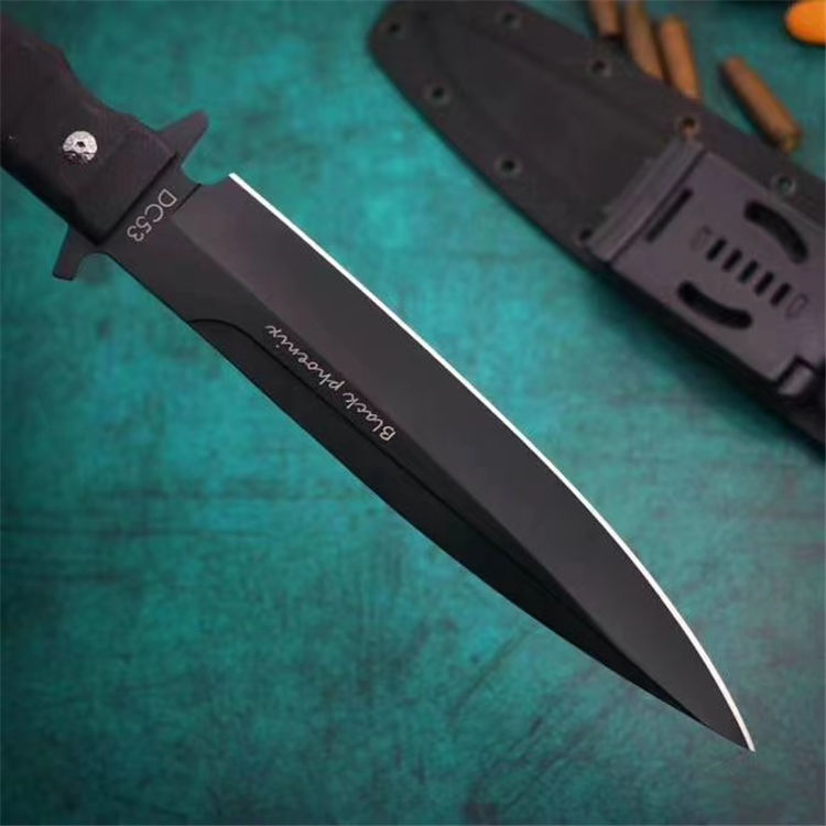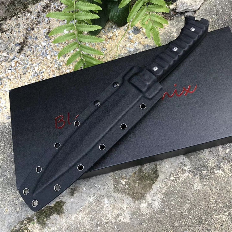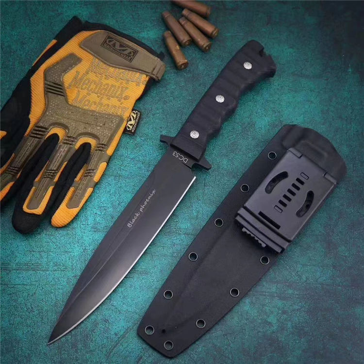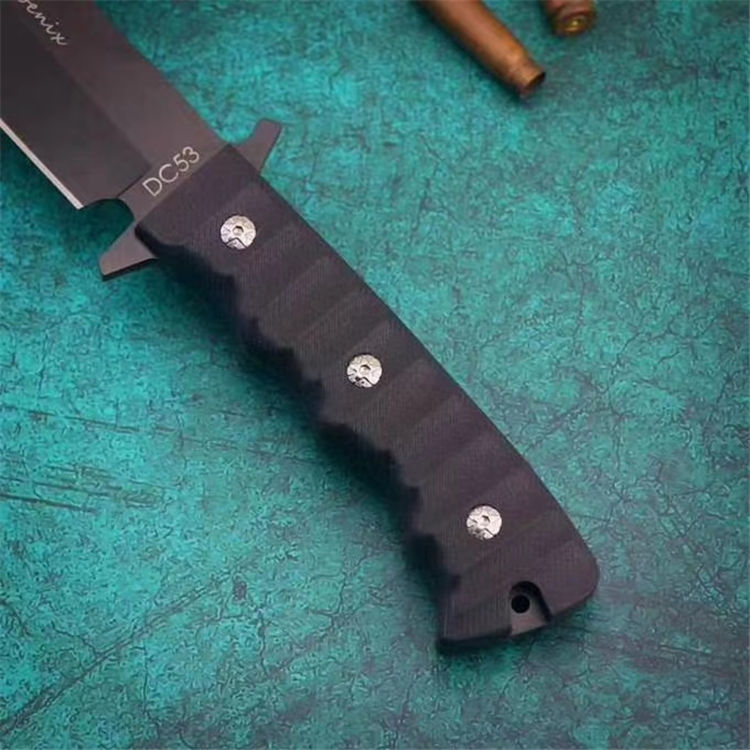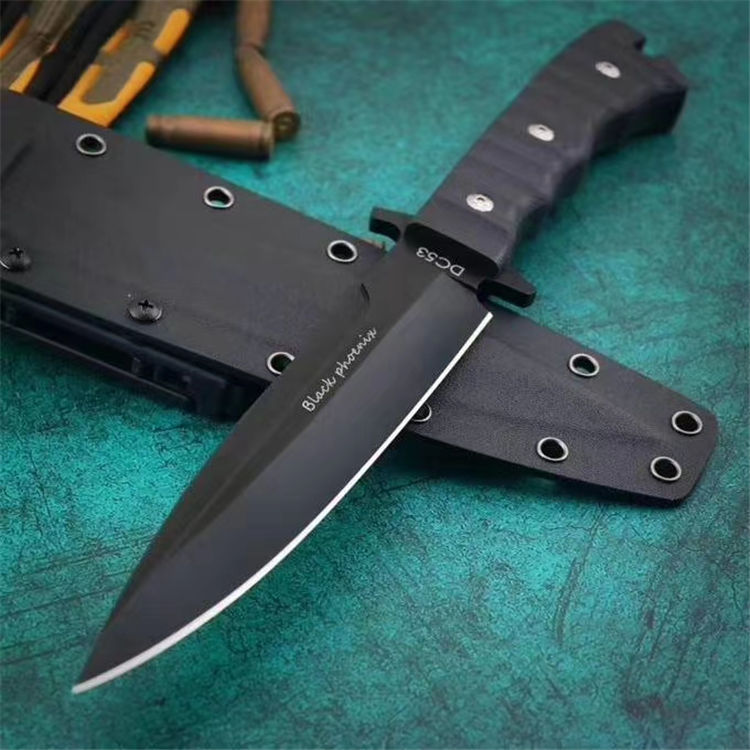 俄罗斯黑版凤凰Black直刀 全长:33cm 刃宽:3.5cm 厚度:6mm 刃长:19cm 刃材:DC53 刀重:410克(不含鞘) 硬度:60HRC(真空深冷处理) 手柄:CNC雕刻进口G10材料 刀鞘:美国进口Kydex板材