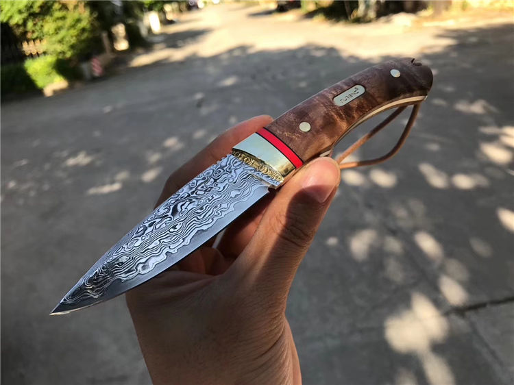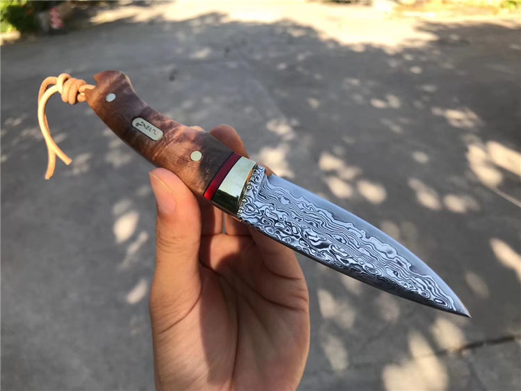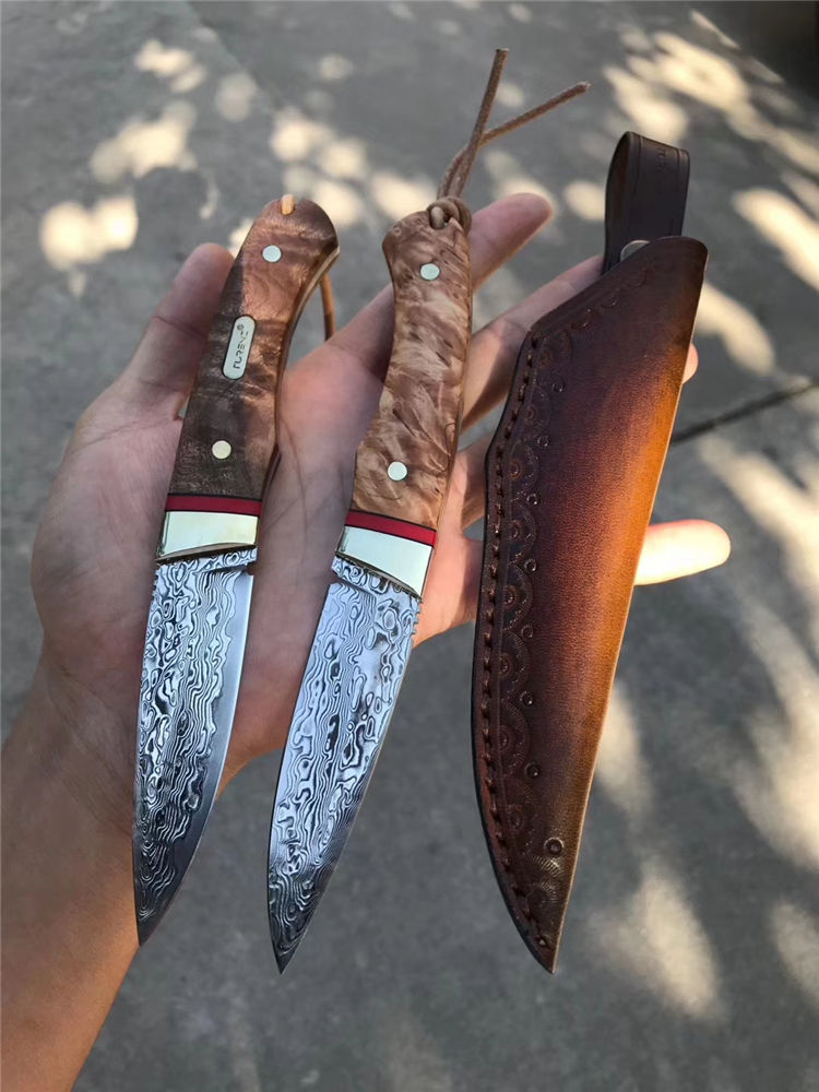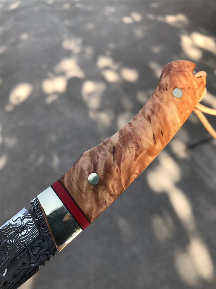 制作工艺:捶打大马士革钢形成花纹,进行平磨水磨开刃、进行抛光酸洗花纹明显呈现,然后再进行装刀手柄周边打砂,开刃清洗包装