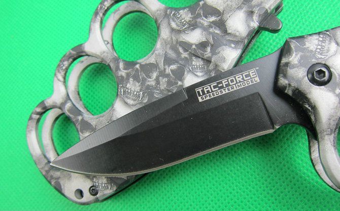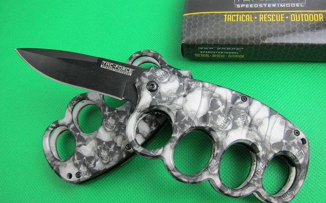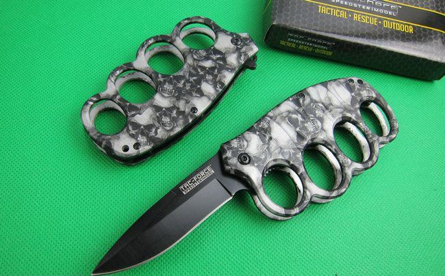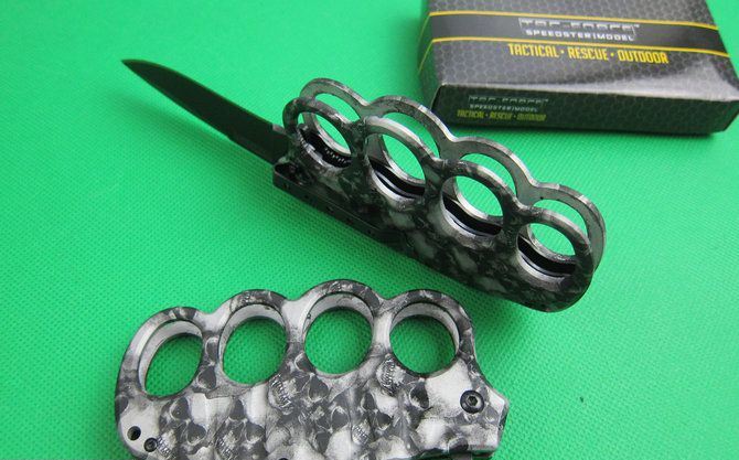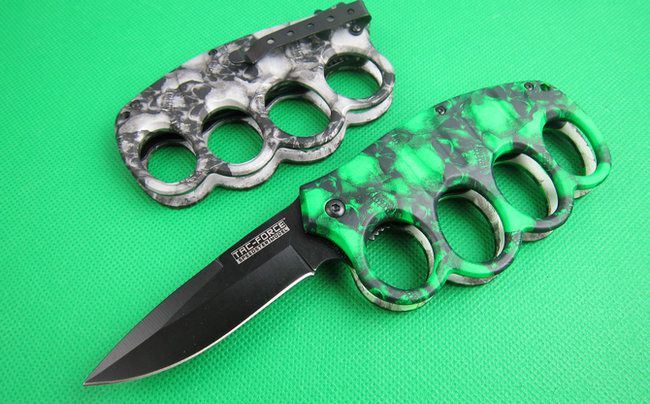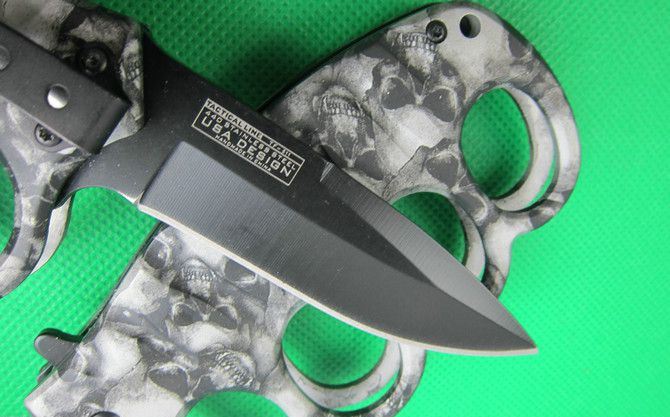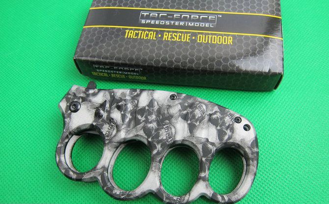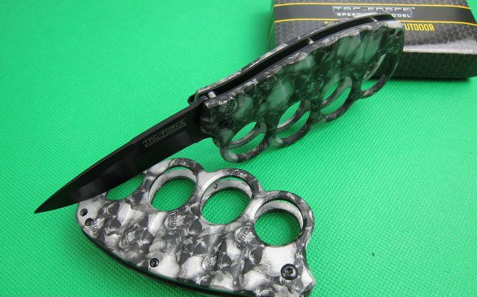TAC迷彩鬼头拳套折刀(两色) 全 长: 20.2cm 刃 长: 8.2cm 刃 宽: 2.5cm(最宽处) 闭 合: 11.8cm 硬 度: 57HRC 刃 厚: 0.31cm 重 量: 210克 表 面: 迷彩,两色任选. 刃 材: 7CR17MOV 柄 材: 金属铝 锁 闭: 线锁,半自动助力开刀