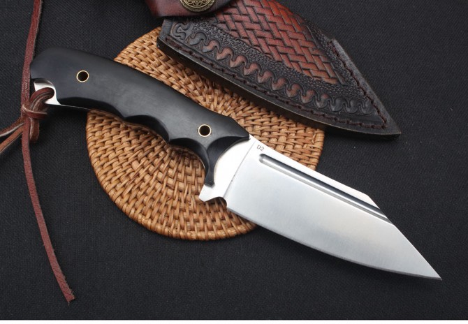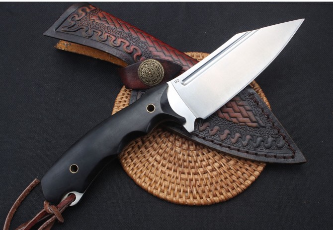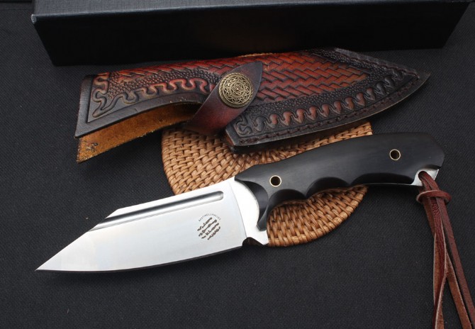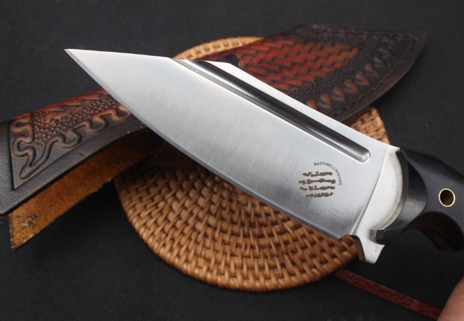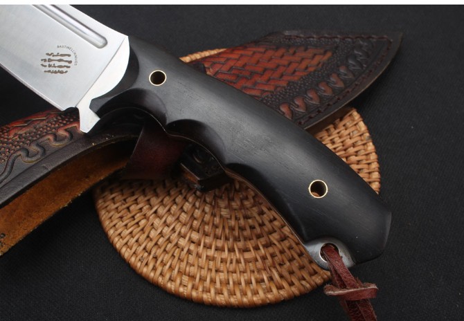 巴斯蒂内利魔甲直刀 类型:直刀 型号:BAS09 全长:22.8cm 刃长:11.5cm 柄长:11.7 刃材:D2钢材 刃宽:3.6cm 刃厚:0.56cm 表面:沙光 硬度:60HRC热处理技术:真空热处理 表面效果:电脑数控水磨,砂光效果 柄材:一体钢+黑檀木 重量:385g含包装配有高端意大利手工植鞣皮皮套礼品盒