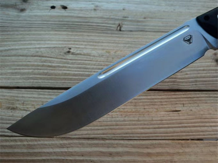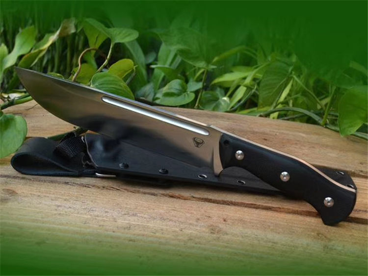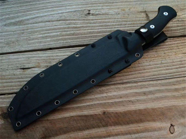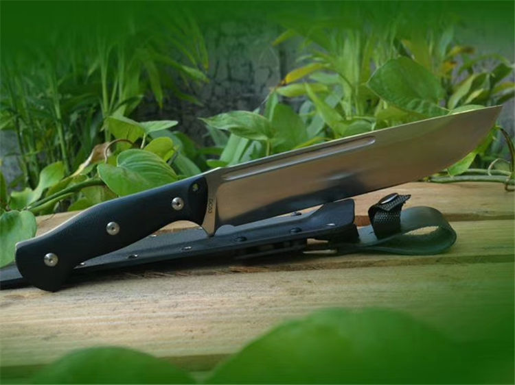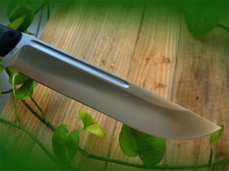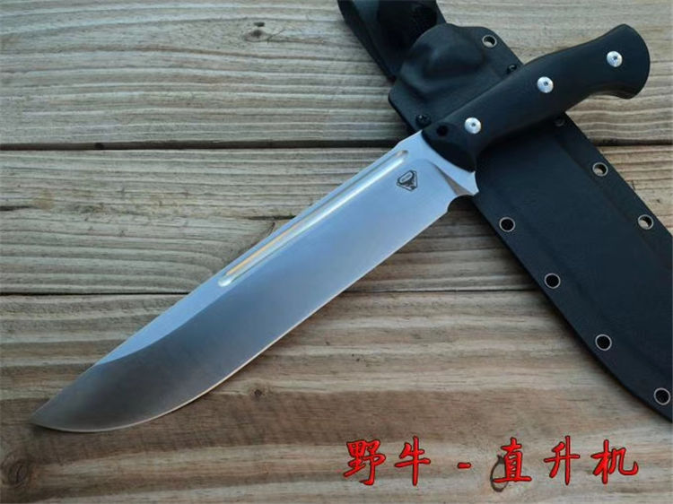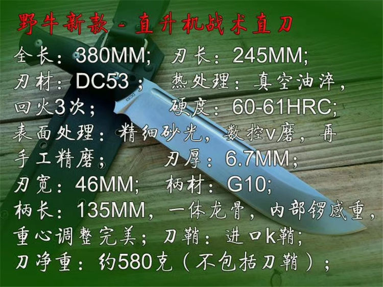 野牛直升机直刀 全长:380MM 刃长:245MM 刃材:DC53 热处理:真空油淬,回火3次 硬度:60-61HRC 表面处理:精细砂光,数控v磨,再手工精磨 刃厚:6.7MM 刃宽:46MM 柄材:G10 柄长:135MM,一体龙骨,内部锣感重,重心调整完美 刀鞘:进口k鞘 刀净重:约580克(不包括刀鞘)