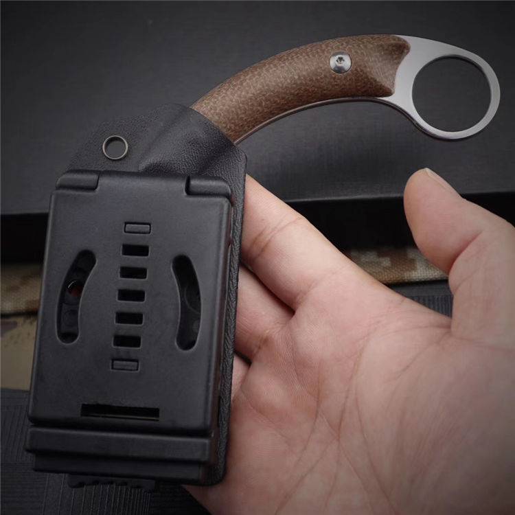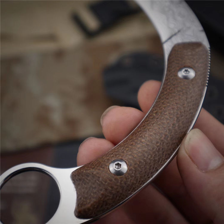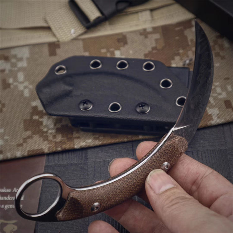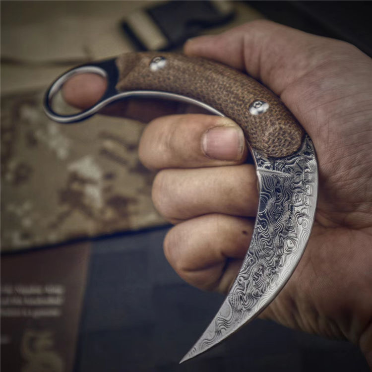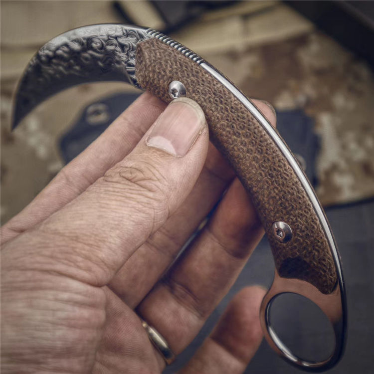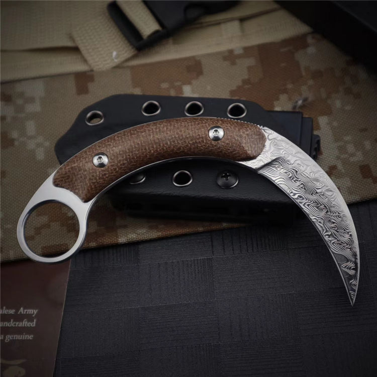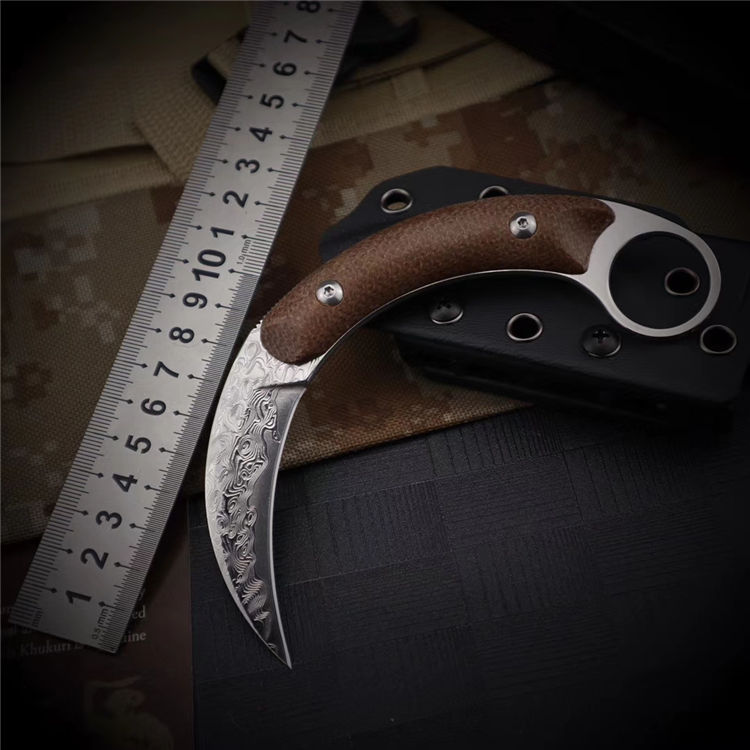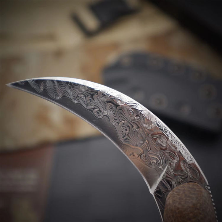 大马士革亚麻柄影月爪刀 全长:14 cm 刃长:6.5cm 柄长:8.9cm 刃宽:1.8cm 刃厚:0.35cm 表面:镜面 重量:180g(包括K鞘) 净重:95g 钢材:大马士革vg10 硬度:HRC59-61 (真空油淬热处理) 刀柄:高密度蟒紋亚麻布板(专供出口材料) 刀鞘:Kydex鞘