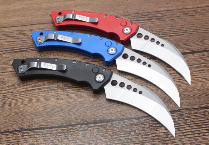 微技术横出弹簧爪刀 全长:23cm 刃长:10cm 刃厚:4mm 刃宽:3.5cm 柄长:13.5cm 刃材:9Cr13不锈钢 硬度:58HRC 净重:148g 毛重:206g(含包装) 表面:CNC数控磨 柄材:铝合金,CNC电脑锣,钨钢尾锥撞头 锁闭:横出弹簧
