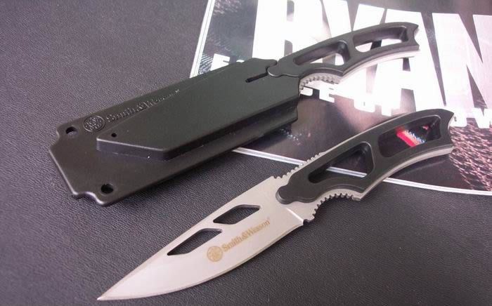 史密斯SW990哨兵刀(哨子刀) 全 长: 17.5cm 刃 长: 8cm 刃 厚: 2.5mm 刃 材: 440 硬 度: 56HRC 表 面: 喷灰砂 柄 材: ABS工程塑料 刀 鞘: ABS 工程塑料 重 量: 60克