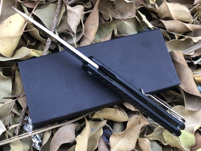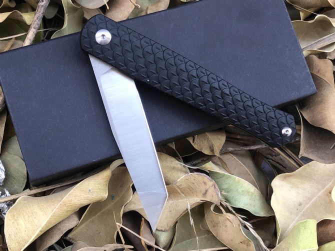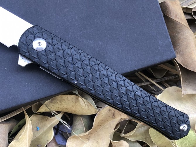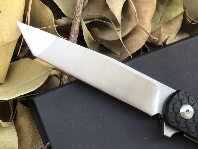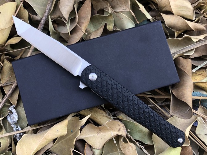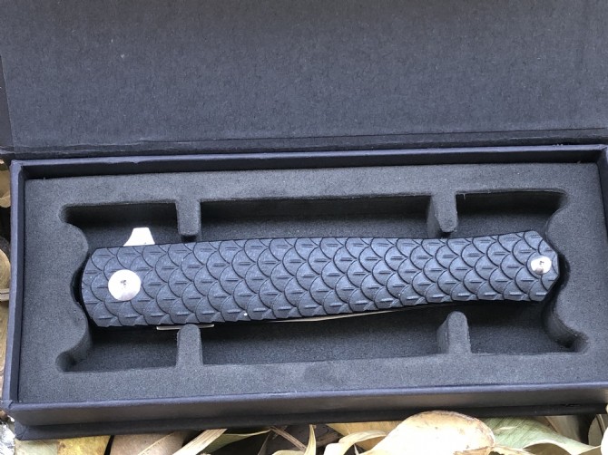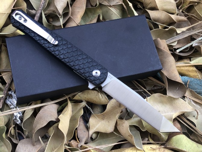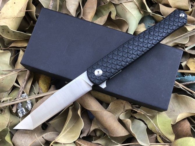 龙鳞轴承快开折刀 总长:210mm 刀片长度:92mm 手柄长度:120mm 刀片厚度:3.2mm(最厚) 刀片宽度;1.8mm 刀片材质:D2 手柄材质:钢+G10 硬度:58-60HRC 刀重量:145克 刀片处理:拉丝 配礼品盒内置轴承滚珠系统