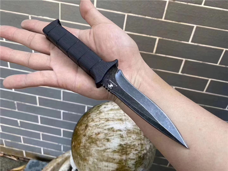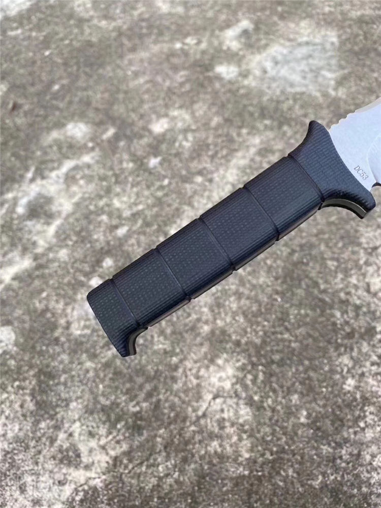 黑龙生化危机克劳撒佩刀 全长:21.7cm 刃长:9.8cm 刃宽:3.2cm 柄长:11.3cm 刃厚:0.5cm 重量:196g(单刀) 柄材:G10 刀鞘:K鞘 钢材: DC53钢 刃处理:V磨,龙骨一体数控激光切割,刀尾带撞击器!刀背带编号 表面处理:石洗/沧桑石洗 硬度: 60-62HRC CNC电脑锣精密加工成型,精细手工打磨处理 热处理: 采用真空热处理,再经过零下80度的深冷处理