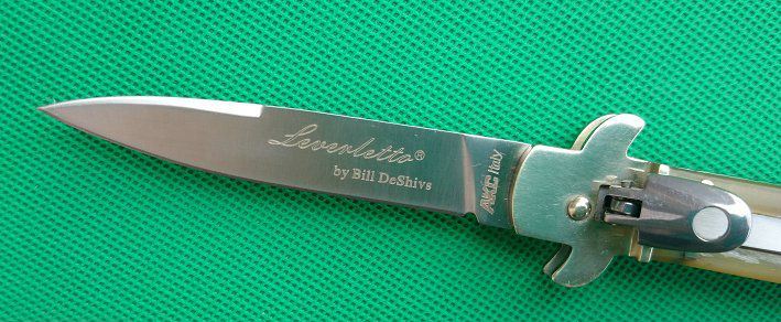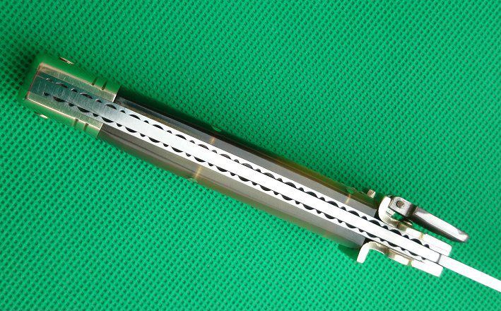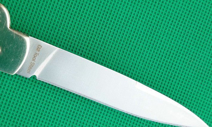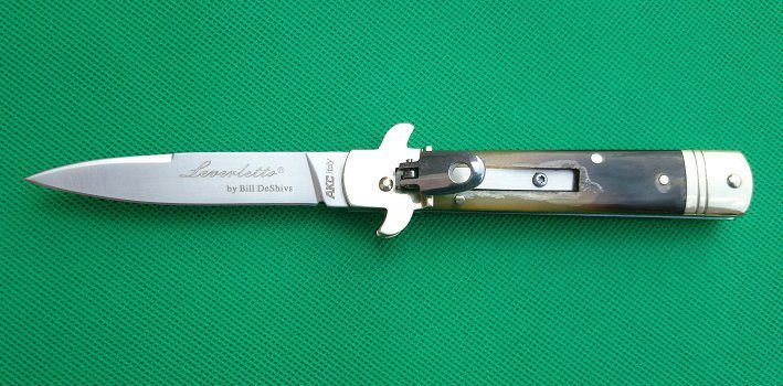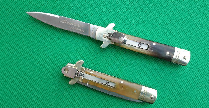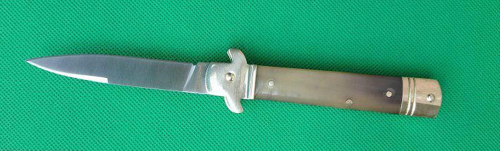 全 长:19.5mm 刃 长:7.6mm 柄 长:13cm 刃 宽:1.35cm(最宽处) 刃 厚:2.6mm 刃 材:D2 硬 度:59-60 刀 柄:天然花牛角 开刀方式:弹簧 重 量:120克 包 装:木盒 意大利黑手党使用的经典刀具-赌徒跳刀,在电影"教父"里出尽了风头!枪刺刃的黑手党侧跳,弹力超强,锁定到位,不会两边摆动现象,采用D2钢和天然鹿角柄线切角加工而成,带有保险装置,刀护手处暗藏闭合开关,出口产品,质量保证!满足把玩和收藏需要.