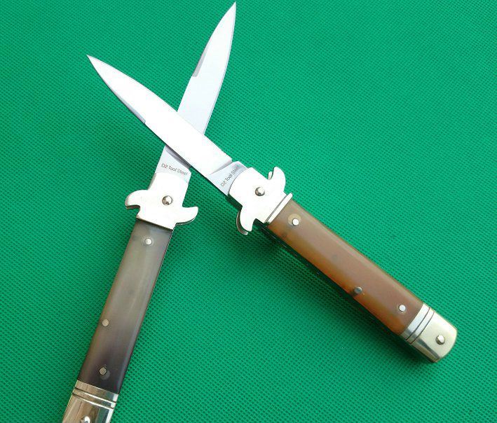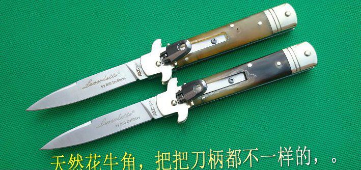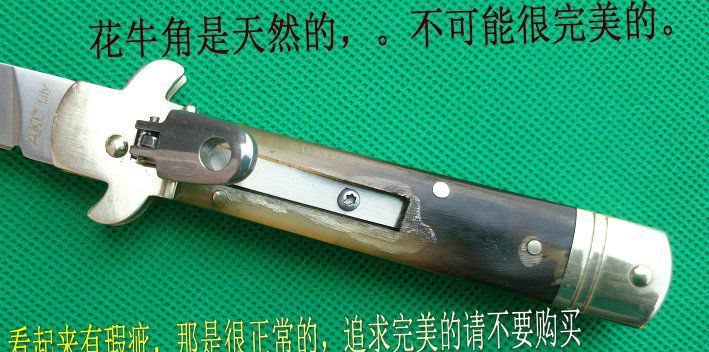 意大利黑手党黑龙代工花牛角柄跳刀 全 长:19.5mm 刃 长:7.6mm 柄 长:13cm 刃 宽:1.35cm(最宽处) 刃 厚:2.6mm 刃 材:D2 硬 度:59-60 刀 柄:天然花牛角 开刀方式:弹簧 重 量:120克 包 装:木盒 意大利黑手党使用的经典刀具-赌徒跳刀,在电影"教父"里出尽了风头!枪刺刃的黑手党侧跳,弹力超强,锁定到位,不会两边摆动现象,采用D2钢和天然鹿角柄线切角加工而成,带有保险装置,刀护手处暗藏闭合开关,出口产品,质量保证!满足把玩和收藏需要.