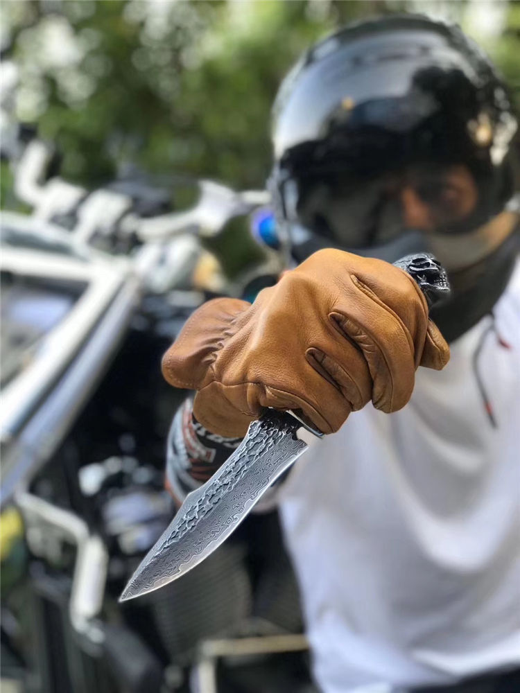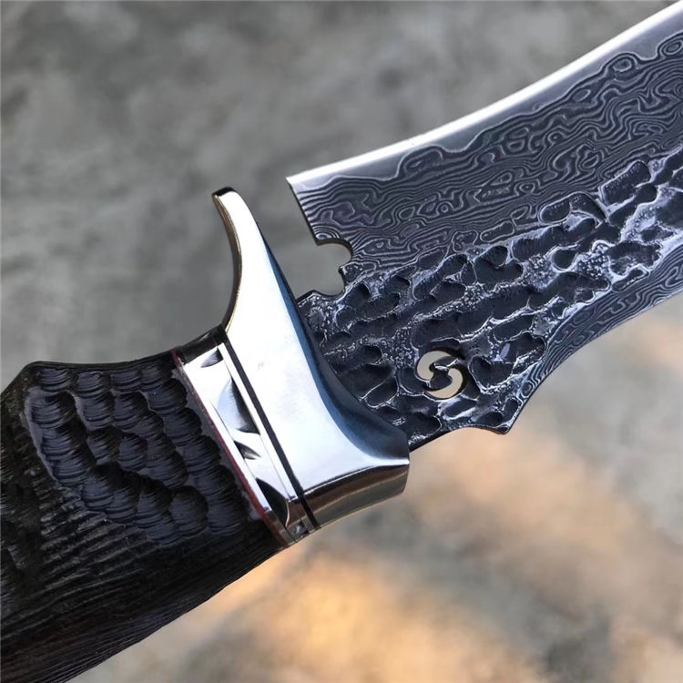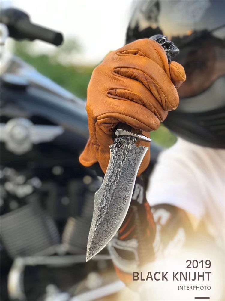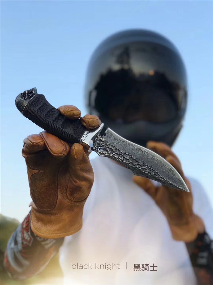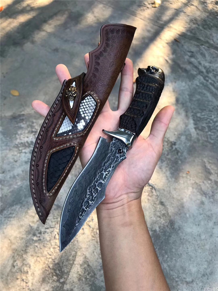 大马士革恶灵黑骑士直刀 总长:26.5cm 刃长:13.2cm 刃厚:4mm 刃宽:4cm 钢材:进口锻造大马士革钢VG10钢芯103层 硬度:60-62HRC 热处理:专业真空热处理 表面工艺:做旧沧桑复古黑工艺保留锤打纹理 重量:252g 柄材:黑檀木+不锈钢挡手,纯手工刮花锉花雕刻+合金钢骷髅头 皮套:意大利进口高品质植鞣皮、手工雕缝线、镶嵌蟒蛇皮 包装:手工复古盒子