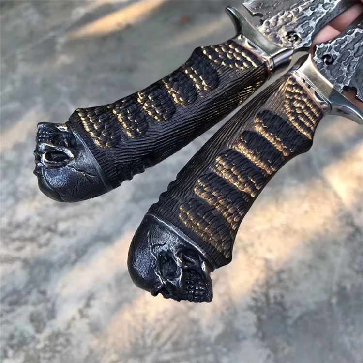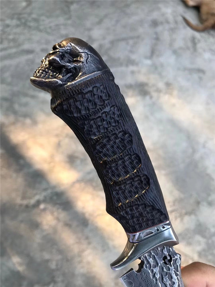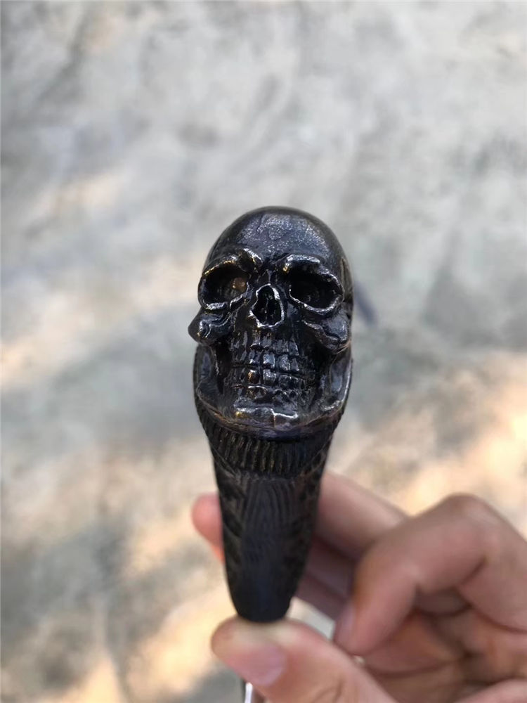 柄材:黑檀木+不锈钢挡手,纯手工刮花锉花雕刻+合金钢骷髅头
