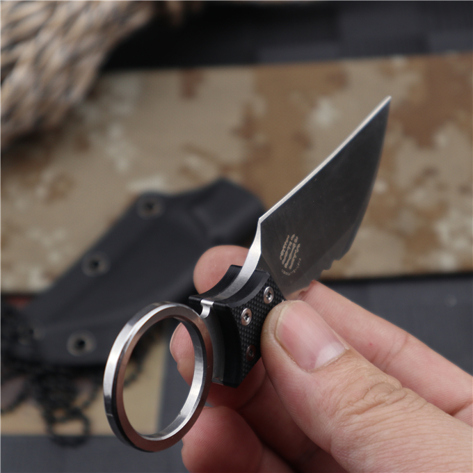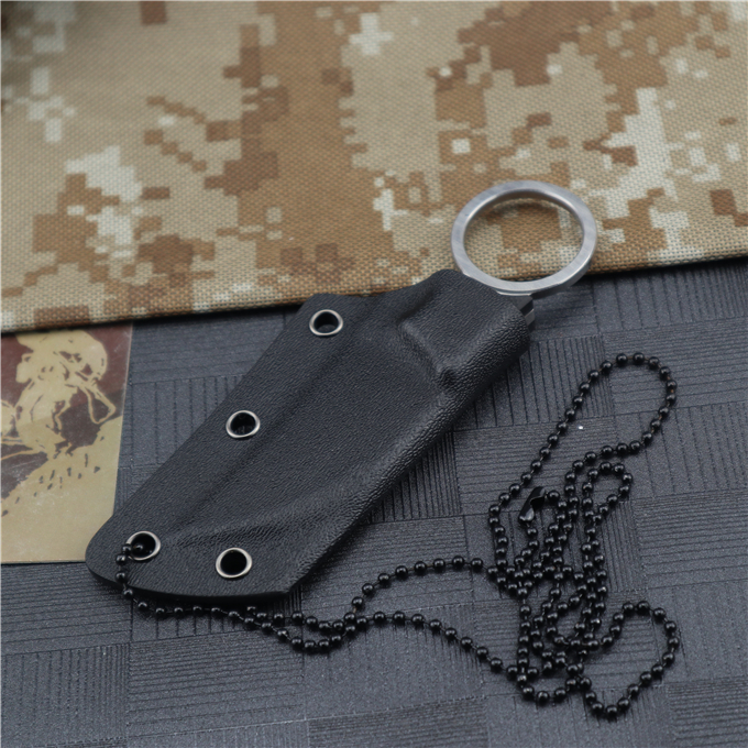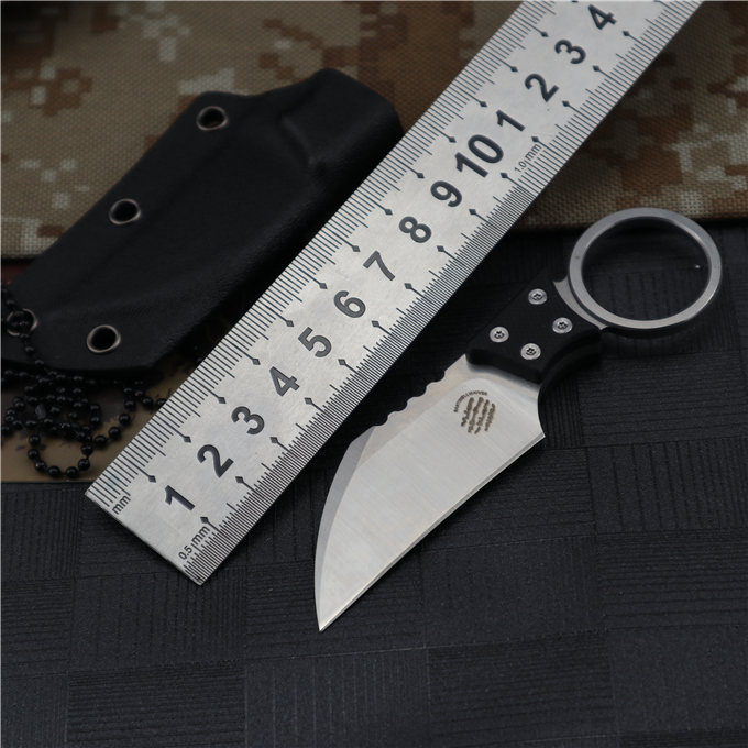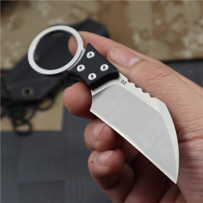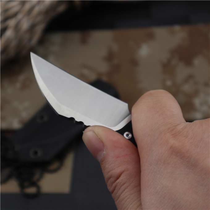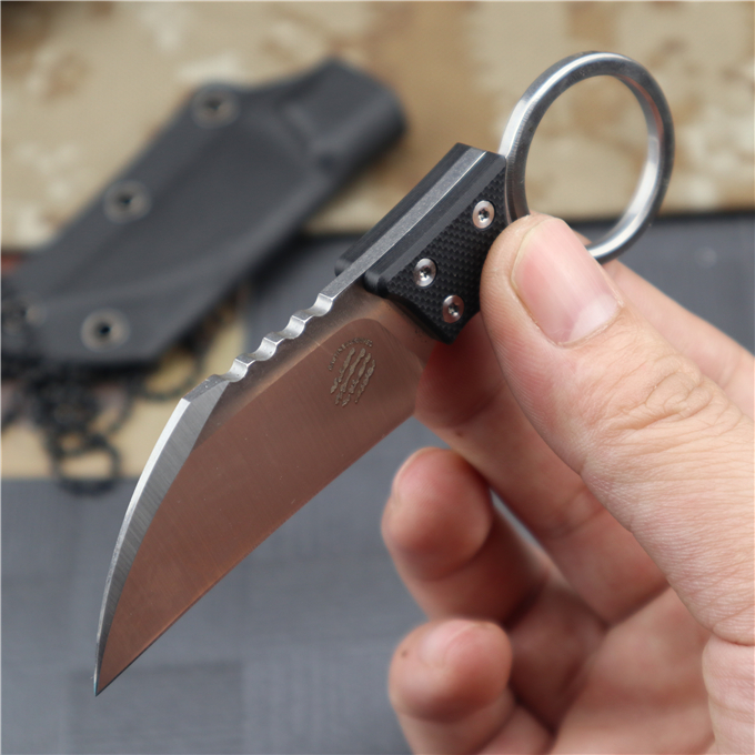 巴斯战甲手刺 全长:11.2CM 刃长:5.7CM 刃厚:0.45CM 刃宽:2.5CM 钢材:D2 刀柄:G10 硬度:60HRC(真空油冷热处理) 表面:数控磨原纹+砂光 刀套:K鞘 重量:100g(含包装)
