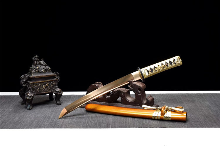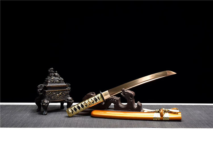 金锋武士短刀 专业测试、请勿模仿 工艺:龙泉古法传统手工艺 装具:铁+合金 刃材:猛钢烤金 柄材:实木皮绳 鞘材:实木漆鞘 赠品:锦盒、养护油、布