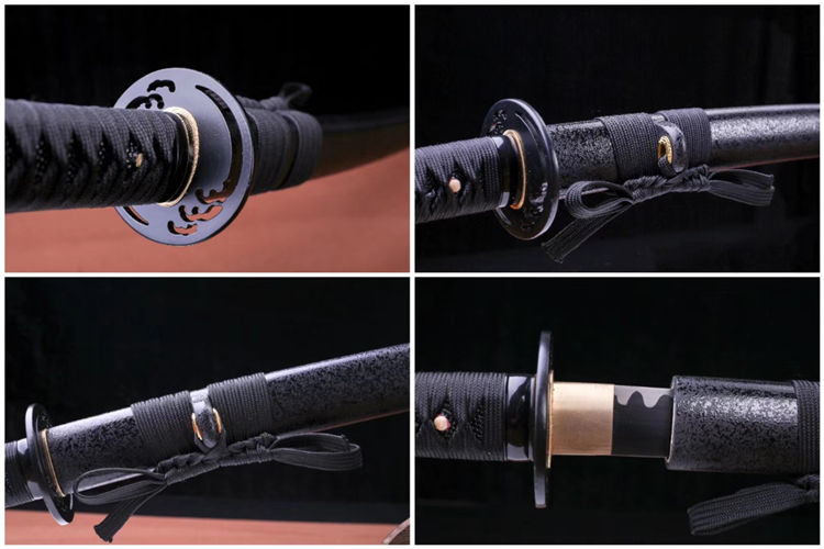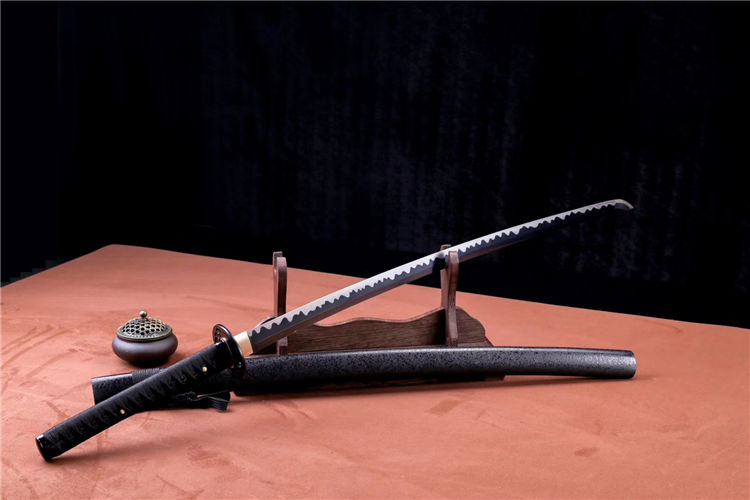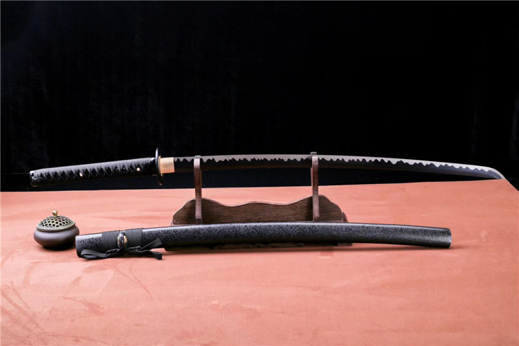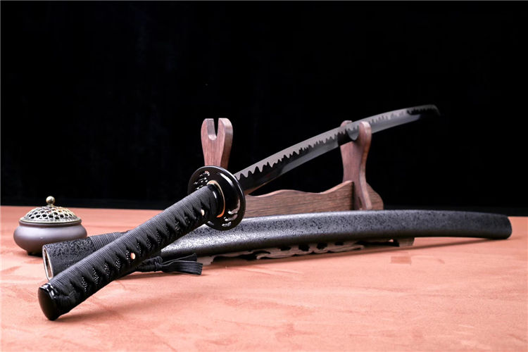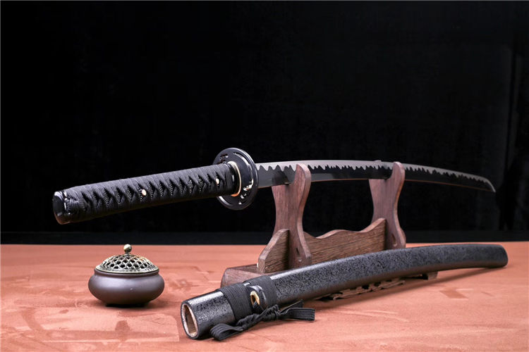 黑山老妖武士刀 专业测试、请勿模仿 刃材:锋钢(发黑研磨灰) 鞘材:实木点漆鞘 柄材:实木穿心柄(刀柄可拆装) 赠品:养护刀油、布、锦盒
