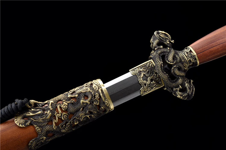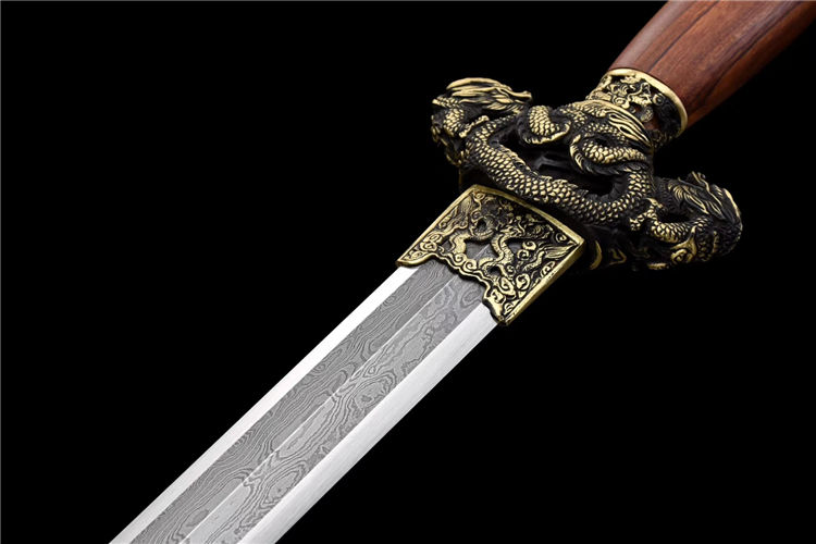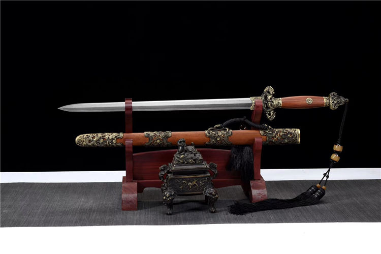 龙锋剑 专业测试、请勿模仿 工艺:龙泉古法传统手工艺 装具:铜装 刃材:花纹钢 柄材:酸枝木 鞘材:酸枝木 赠品:高端锦盒、养护油、布