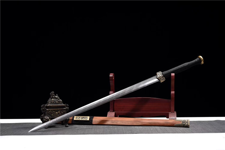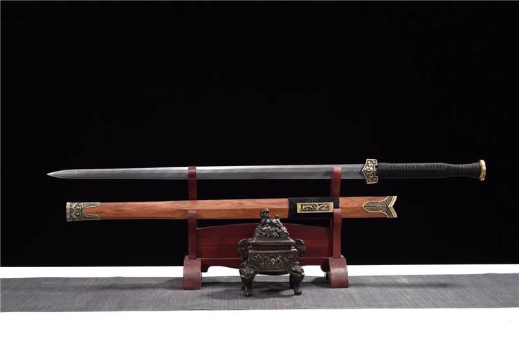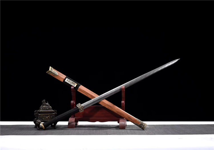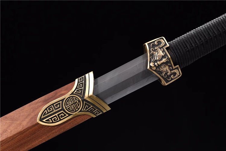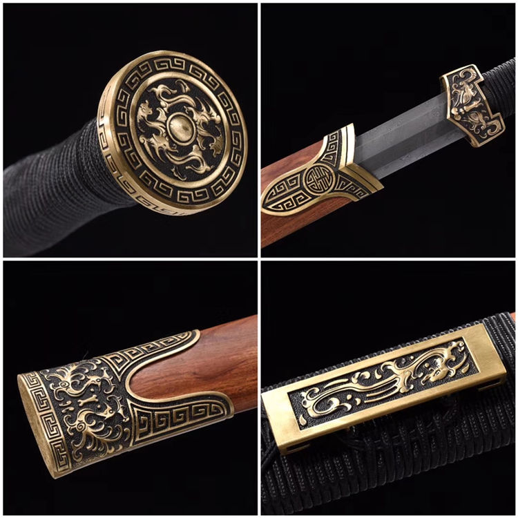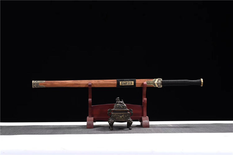 问鼎汉剑 专业测试、请勿模仿 工艺:龙泉古法传统手工艺 装具:铜装 刃材:性能扭转花纹钢 柄材:实木绕绳 鞘材:酸枝木 赠品:高端锦盒、镜袋、养护油、布
