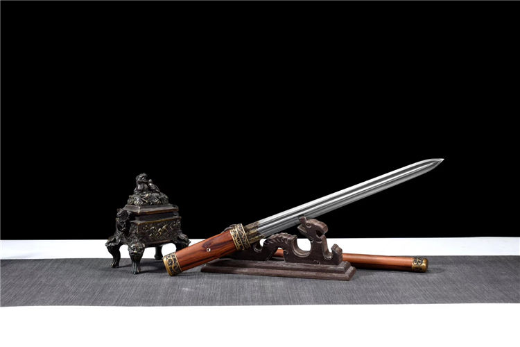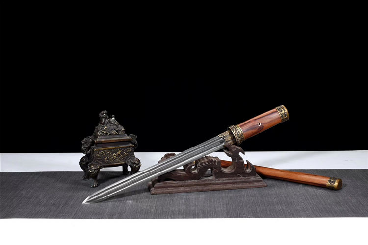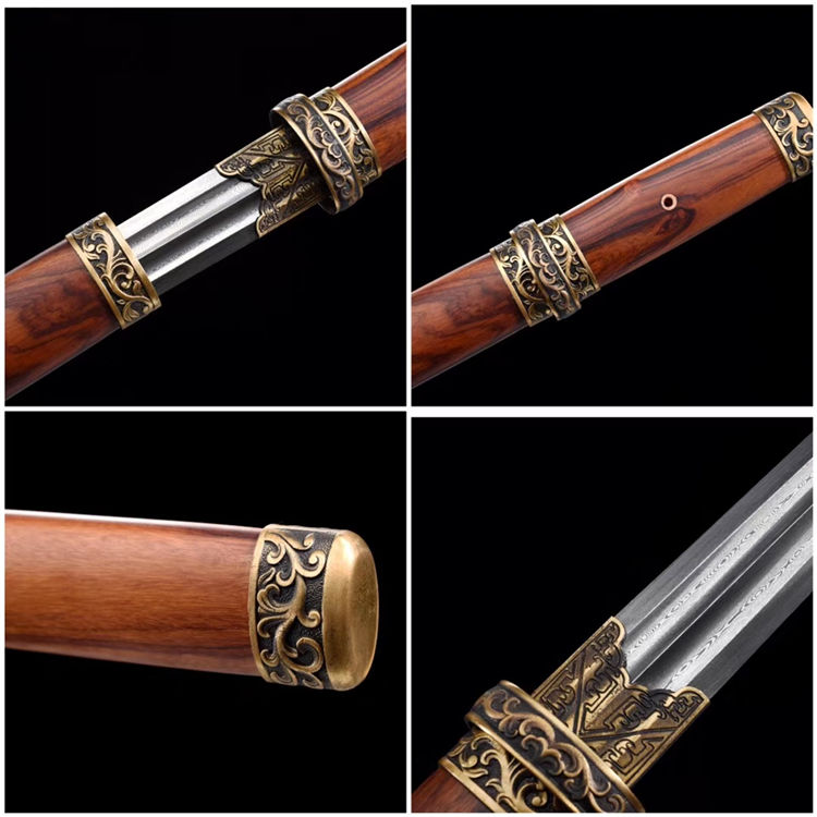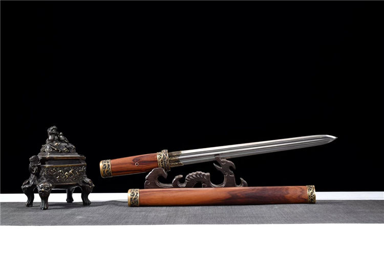 金钢刺剑 专业测试、请勿模仿 工艺:龙泉古法传统手工艺 装具:铜装 刃材:高性能花纹钢 柄材:酸枝木 鞘材:酸枝木 赠品:高端锦盒、养护油、布