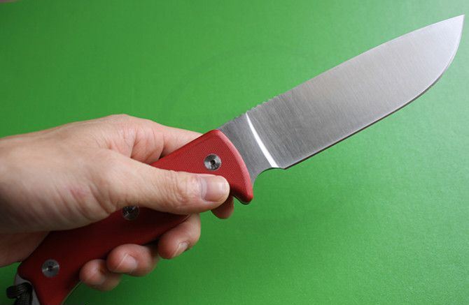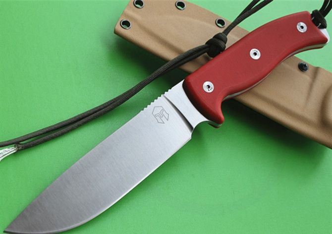 小鲁工E6生存刀 全 长:29.5cm 刃 长:16.2cm 刃 厚:4.5mm 刃 材:DC53 柄 材:红色G10 硬 度:59Hrc 表 面:金属拉丝 刀 套:K鞘 净 重:320g 工 艺:水磨刃/切削 类 型:中型