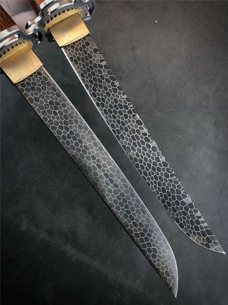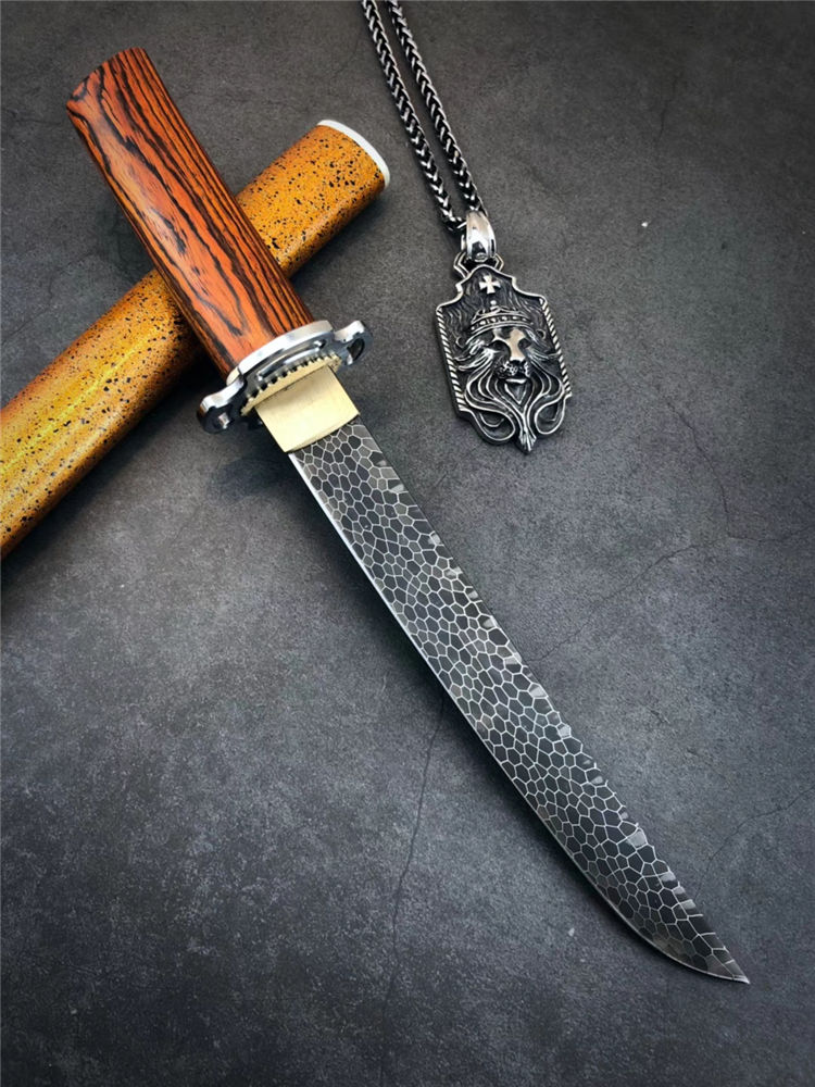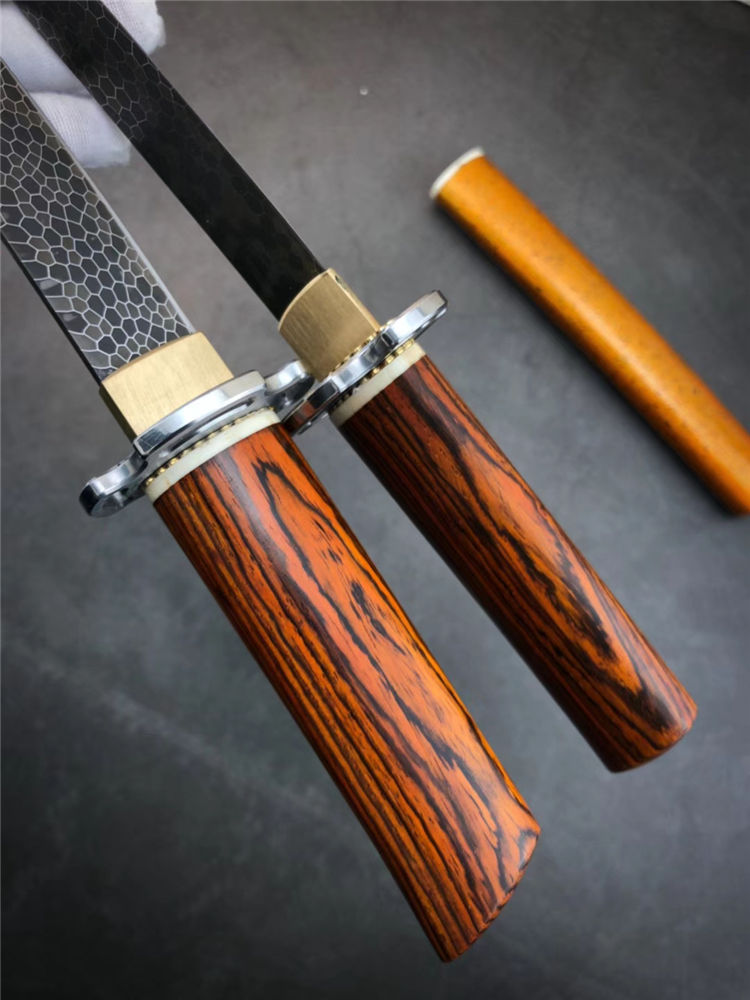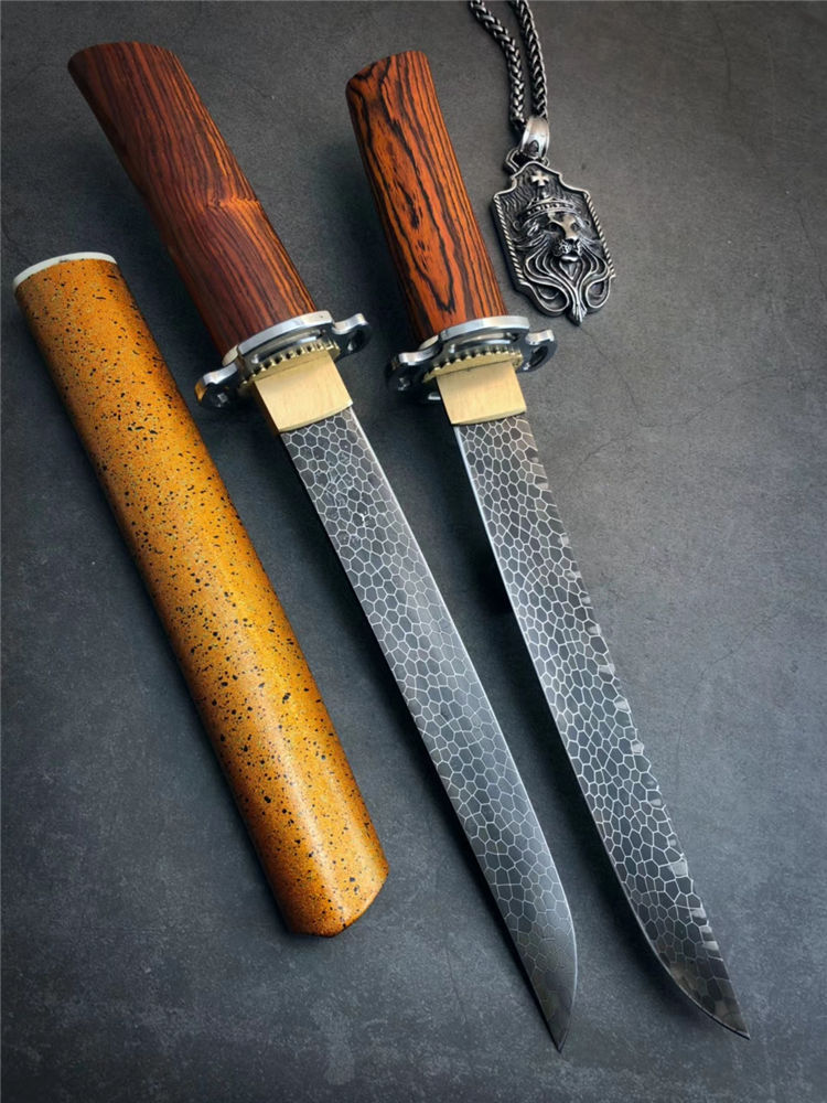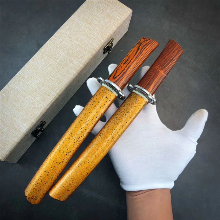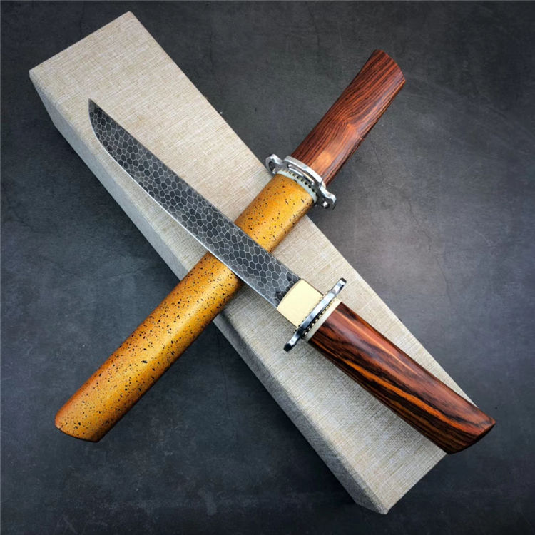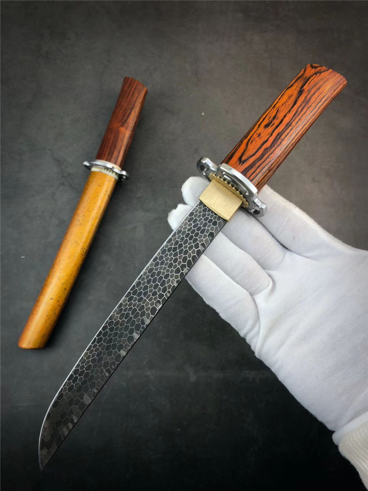 大马士革神峯武士刀 总长:约29cm 刃长:18cm 刃厚:4MM 刃宽:2.1cm 柄材:黄檀木+骨头隔片 钢头:不锈钢刀镡,黄铜切羽 硬度:60HRC,真空热处理 钢材:龙鳞纹大马士革钢 开刃方式:手工哈刃锋利无比 刀鞘:碎花漆工艺,金底黑花漆,金光闪耀高大尚 盒子包装:文玩布艺包装盒,精美包装,送礼收藏