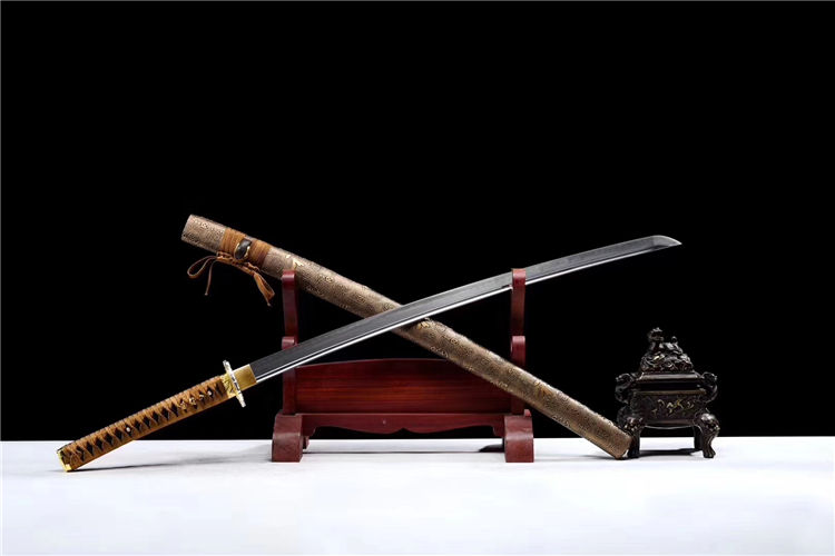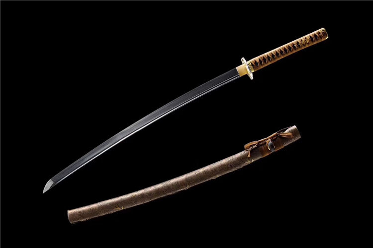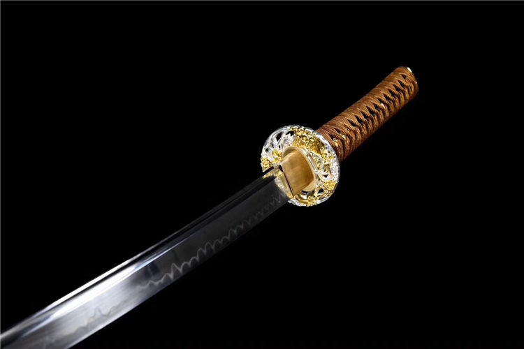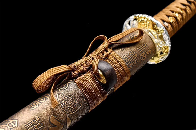 秀影武士刀 专业测试、请勿模仿 刃材:T10钢(古法覆土烧刃) 鞘材:实木裹皮鞘 柄材:实木裹绳(刀柄可拆装) 装具:双色合金套装 赠品:养护刀油、锦盒