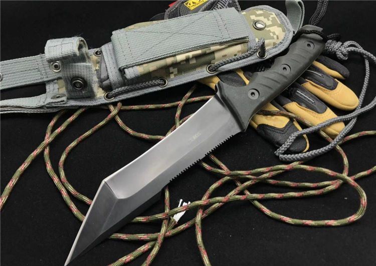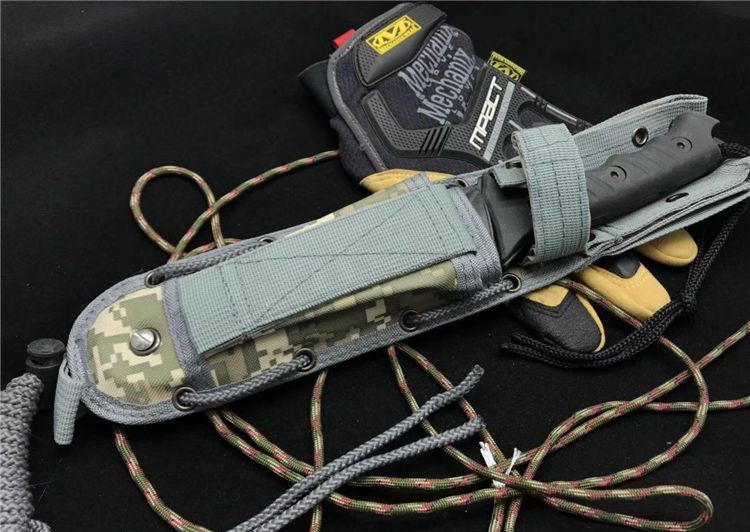 全 长:30cm 刃 长:15cm 柄 长:14cm 刃 厚:5.5mm 刃 材:5CR13 硬 度:57HRC 净 重:410g 总 重:700g(包括纸盒和刀鞘) 柄 材:工和橡胶 表 面:发黑钛 刀 鞘:CORDURA(科杜拉)