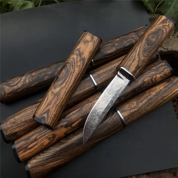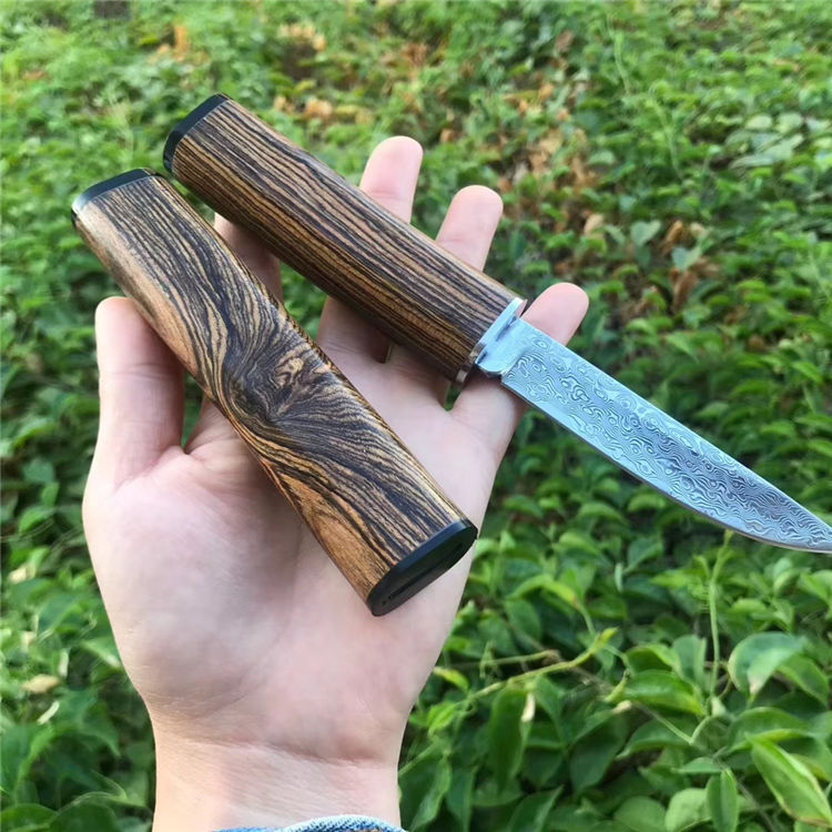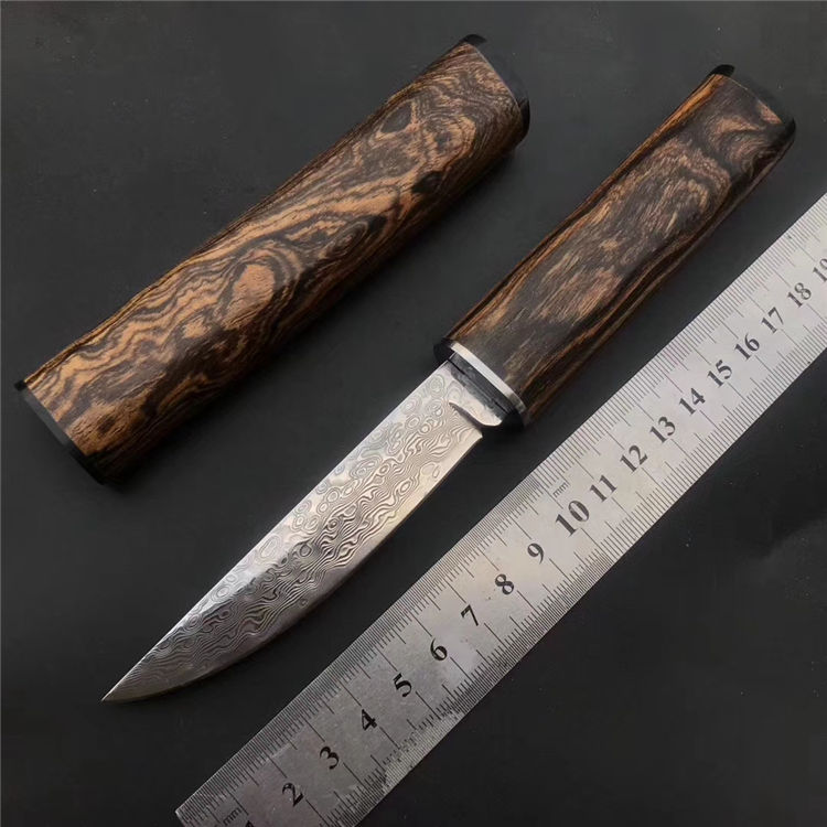 大马士革斑马武士刀 总长:22CM 刃长:9.5CM 刃厚:3MM 刃宽:1.8CM 钢材:锻造大马士革钢67层VG10钢芯层 硬度:59-60HRC 热处理:真空热处理、油淬回火 开刃方式:水冷多次开刃 表面效果:抛光工艺 制作工艺:捶打大马士革钢形成花纹,进行平磨水磨开刃、进行抛光酸洗花纹明显呈现,然后再进行装刀手柄周边打砂 柄材:精选黄金樟木+黑牛角、木头一体镶嵌直入式 包装:高级锦盒子包装