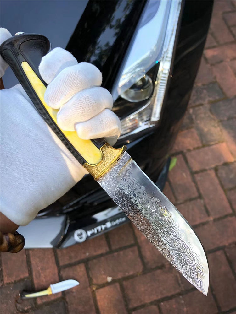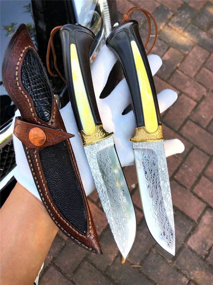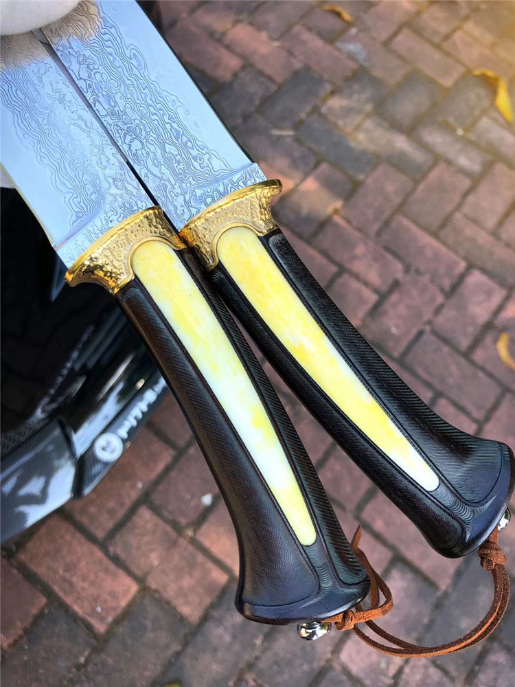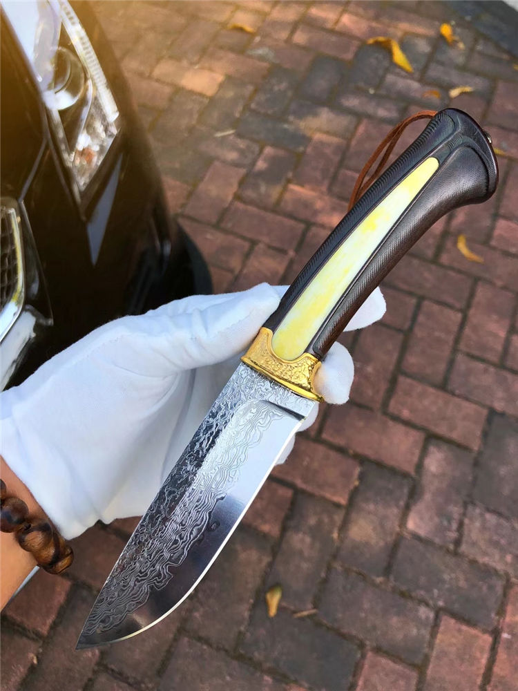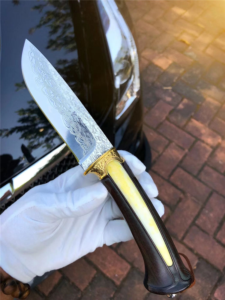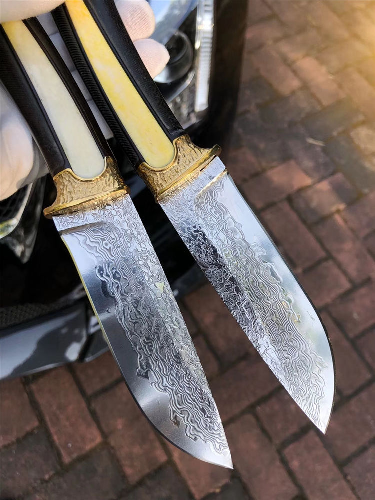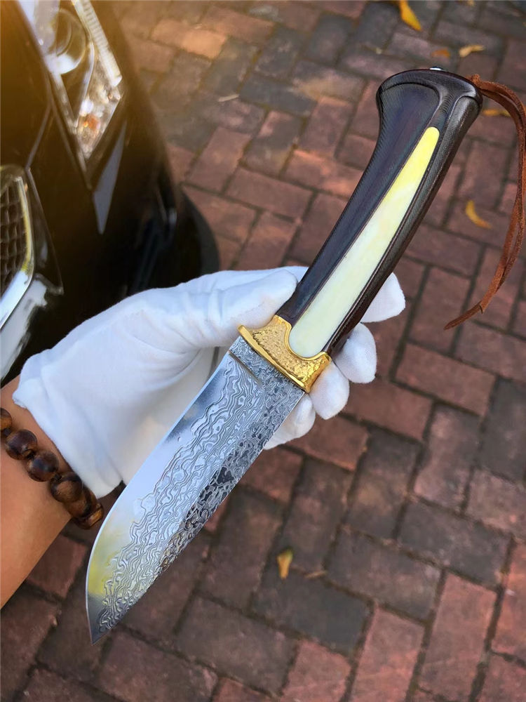 大马士革领袖世家直刀 总长:24cm 刃长:11cm 手柄:12.5cm 厚度:3.5mm 刃宽:3cm 钢材:日本进口锻造大马士革VG10钢、真空热处理 硬度:60HRC 开刃方式:手工三道细磨开锋 柄材:黄铜护手+镶嵌天然牛骨+进口黑檀木 包装:手工黑色盒+保养油1瓶