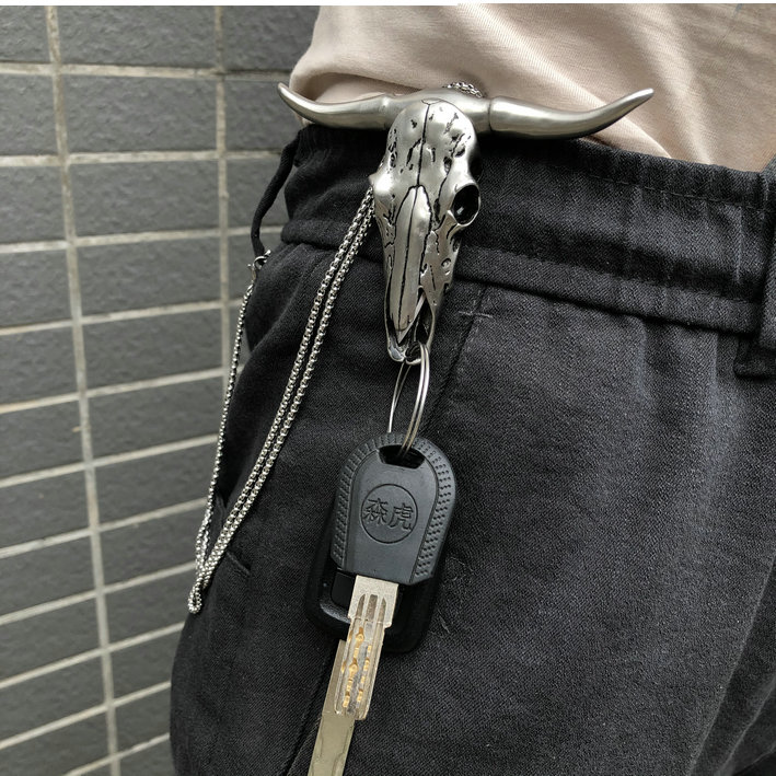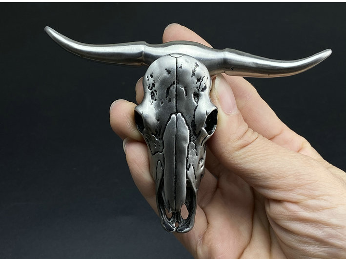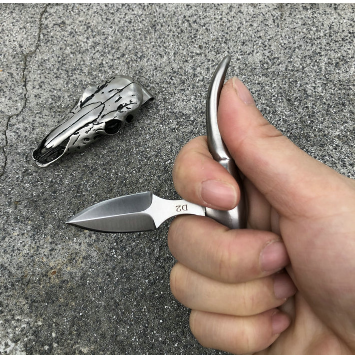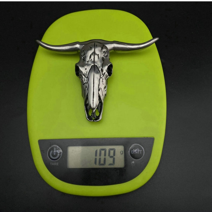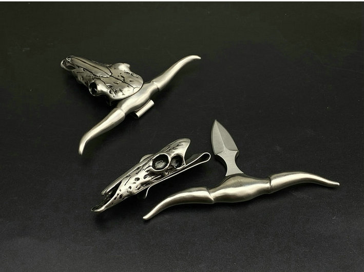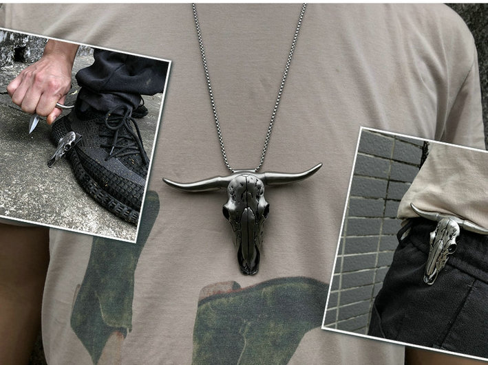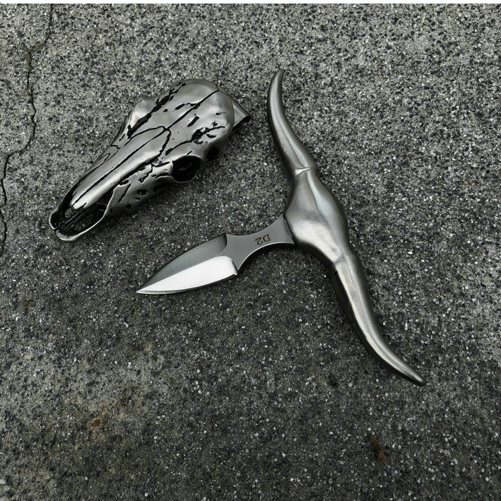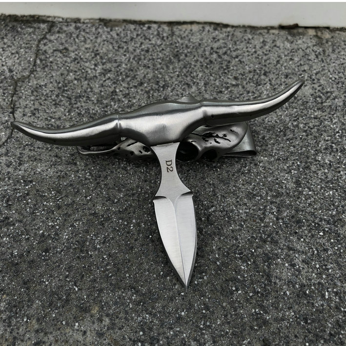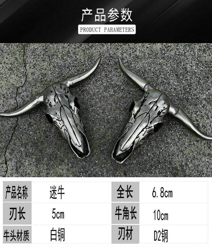D2钢迷牛手刺 全长:6.8cm 宽:10cm 刃长:5cm 牛头材质:白铜 刃材:D2钢 重量:109克 用途广泛,可以当吊坠、茶锥、皮带卡扣、车载饰品等