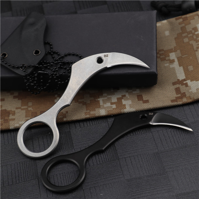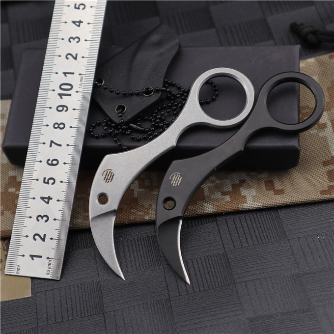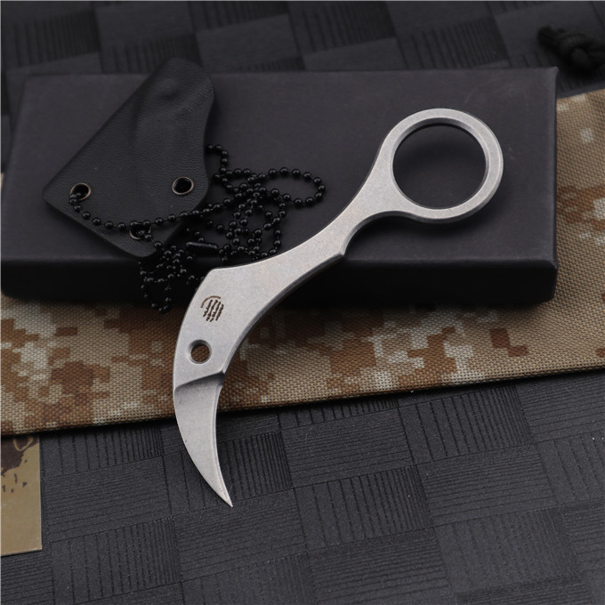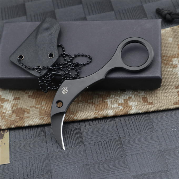 巴斯小麻雀爪刀 全长:12.5CM 刃长:3.3CM 刃厚:0.3CM 钢材:D2 硬度:59HRC(真空油冷热处理) 表面:白石洗或黑钛 刀柄:黑色G10 刀套:K鞘 重量:70g(含包装) 包装:黑色礼品盒