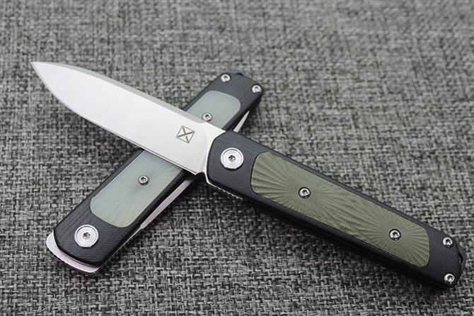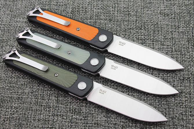 YX622折刀 总长:165mm 叶度:72mm 柄长:93mm 片厚:2.95mm 片宽:19mm 表面处理:缎面 统:单排钢球 硬度:59-60HRC 净重:57克 材质:14C28N 柄材:钢+G10 包装:原包装,便于转售
