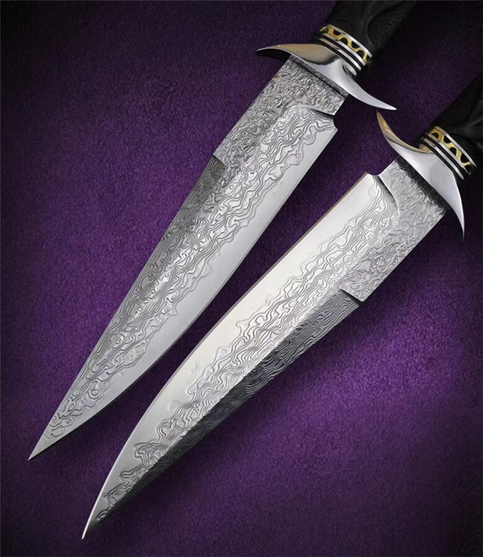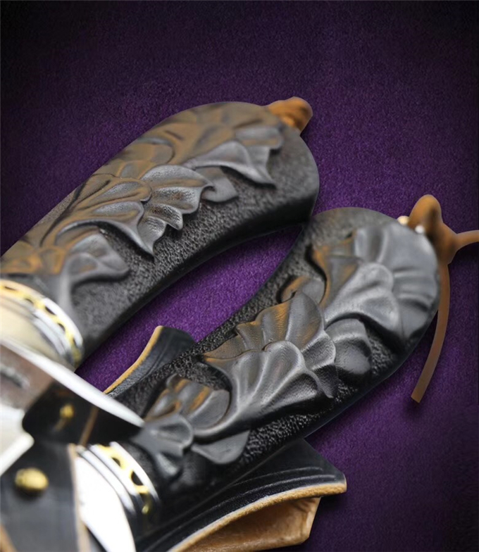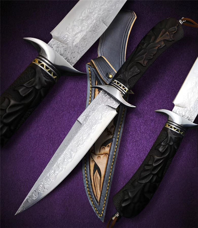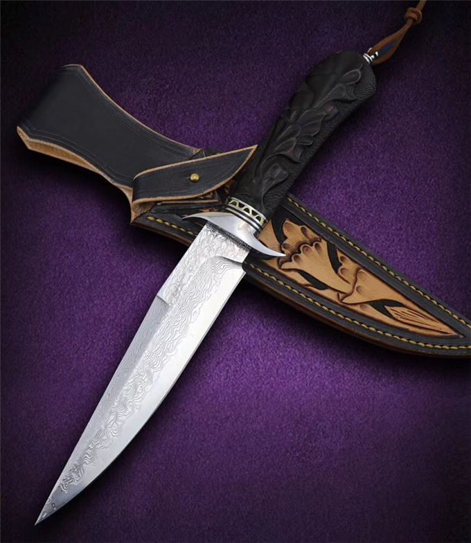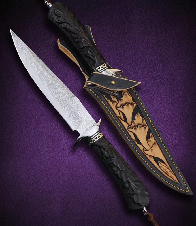 大马士革蓬博直刀 总长:29cm 刃长:15.3cm 柄长:13.5cm 刃厚:3.5MM 钢材:日本VG10高硬度锻造大马士革钢,专业真空热处理硬度达到60HRC 柄材:钢头+黄铜隔片+黑檀木手工雕刻荷花图纹 包装皮套:高级手工盒+意大利手工进口植鞣雕花复古刀套