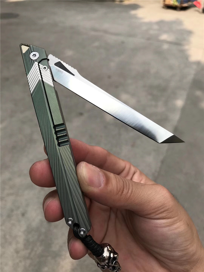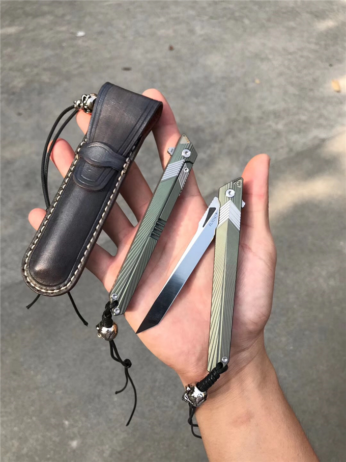 M390粉末钢神笔折刀 总长:21.5CM 刃长:9.5CM 刃厚:2.5MM 刃宽:1.4CM 钢材:奥地利M390粉末钢与瑞典山特维克14C28N粉末钢两种 硬度:分别是60-62HRC与60-61HRC 热处理:真空深冷热处理 柄材:TC4钛合金与TC4钛+G10材质,配骷髅头吊坠 皮套:纯手工意大利进口手工雕花皮套手工缝线植鞣皮 包装:手工盒子包装