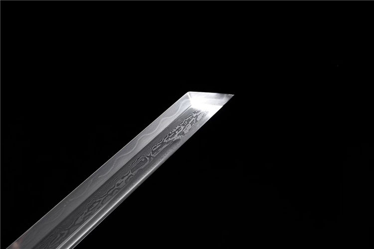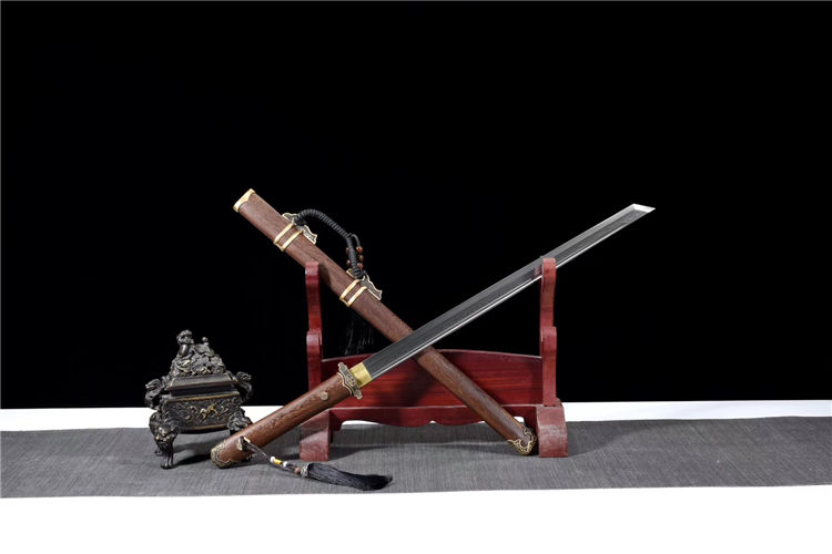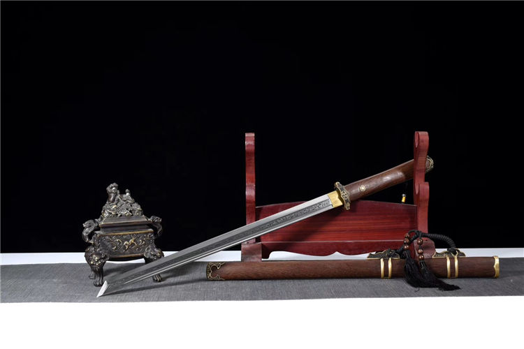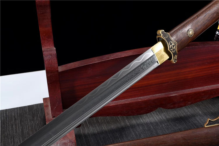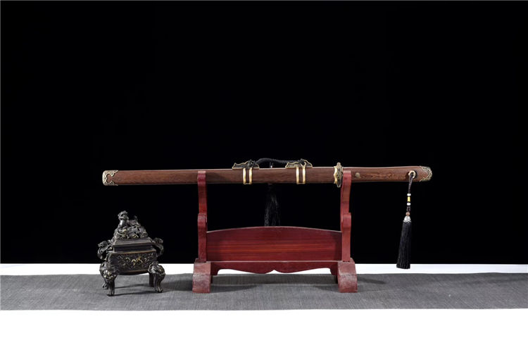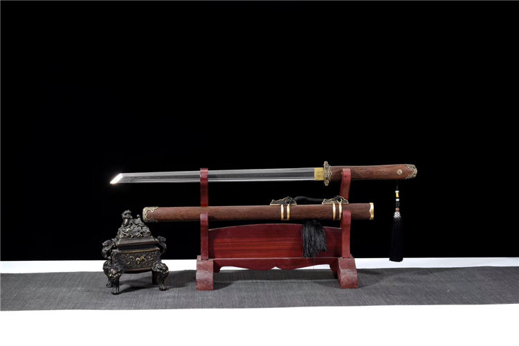 20寸简装烧刃唐刀 专业测试、请勿模仿 工艺:龙泉古法传统手工艺 装具:纯铜 刃材:花纹钢烧刃 柄材:花梨木 鞘材:花梨木 赠品:锦盒、养护油、布