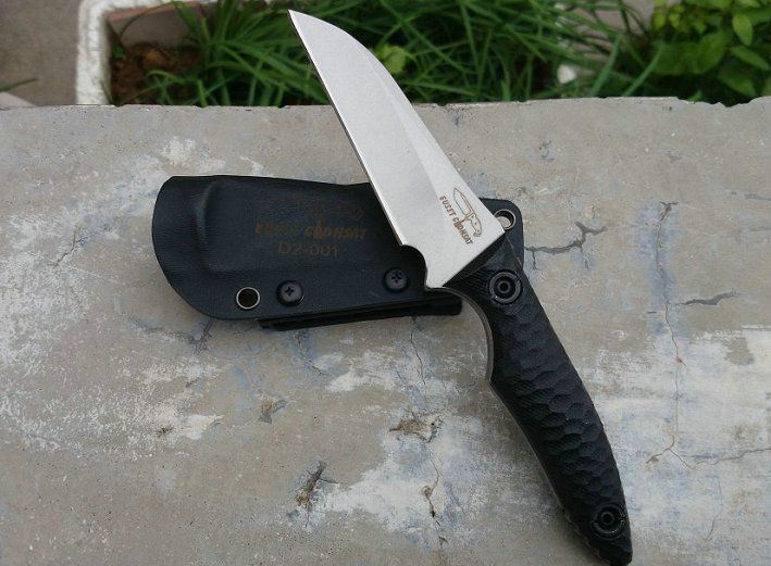 百炼代工D2钢巴斯 类型:小直刀 刃材:D2钢 手柄:黑色G10 表面处理:石洗 刀具全长 21.8CM 刃长 9.8CM 刃厚 0.52CM 硬度 60±1HRC 热处理:真空+深冷处理 重量:单刀(230克) 连刀鞘:300克 配件:加厚K鞘、高级礼品盒