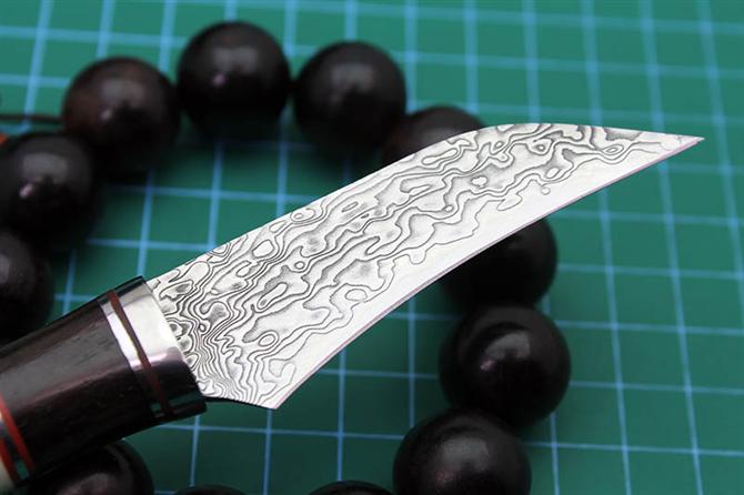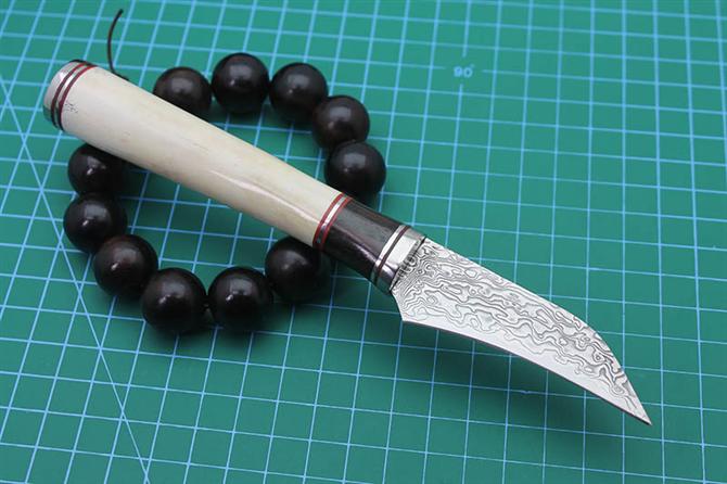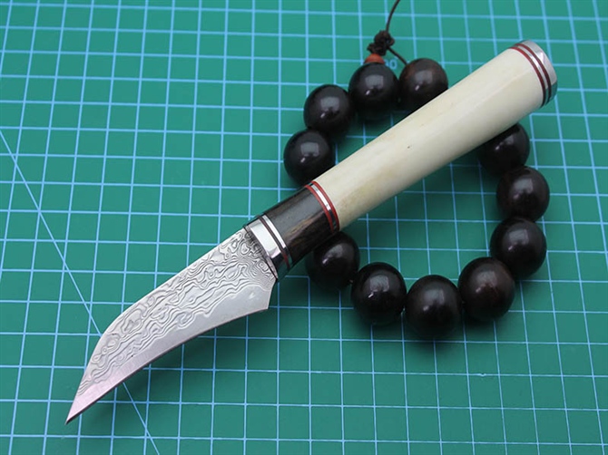 大马士革牛骨鱼刀 全长:18.5cm 刃长:7cm 柄长:11cm 刃厚:2mm 刃宽:2cm 刃材:8CR13MOV大马士革钢 硬度:57-59HRC 重量:约140克(含包装) 表面:锻打大马士革花纹 柄材:牛骨+黑木+钢头 配送:礼盒