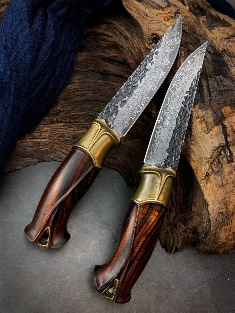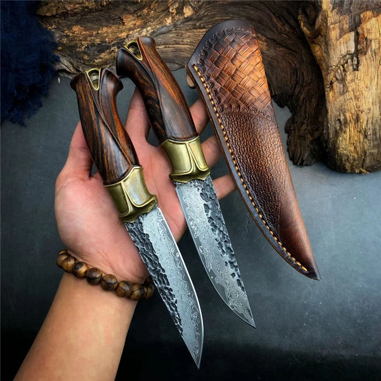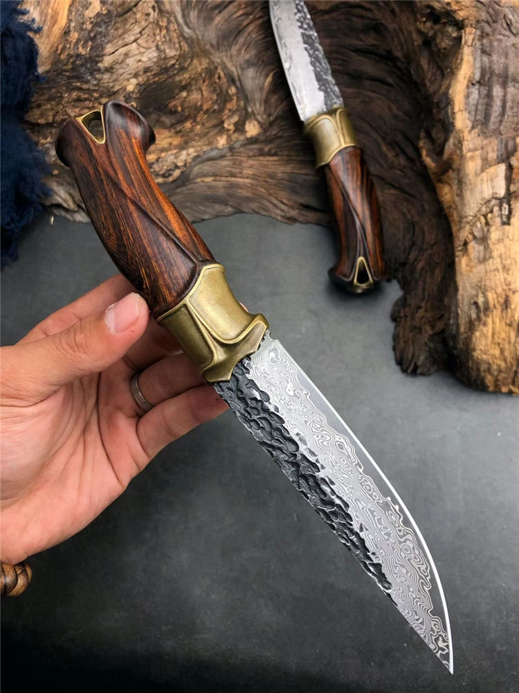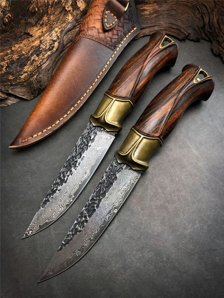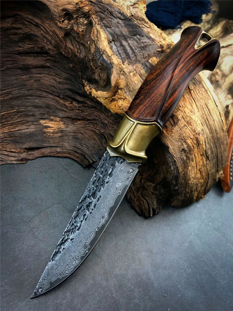 大马士革泰坦直刀 总长:23cm 刃长:11.5cm 手柄:11.5cm 刃厚:4MM 刃宽:2.8cm 刃材:进口锻造VG10大马士革钢 硬度:60-61HRC 开刃方式:二次手工开刃 柄材:纯黄铜复古3D层叠浮雕刀隔+美国沙铁木 皮套:意大利纯手工进口制作缝线着色,雕刻花纹,质感非常好,复古气质 包装:手工盒子包装