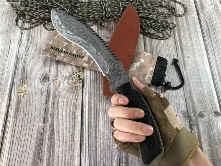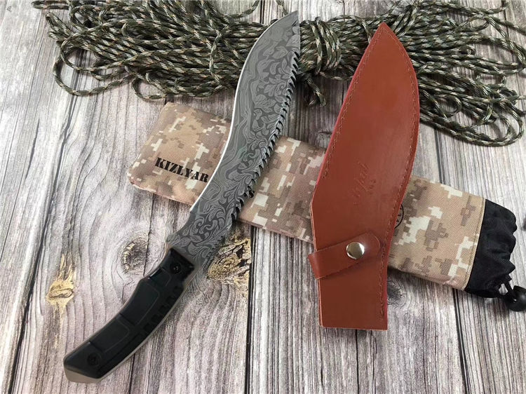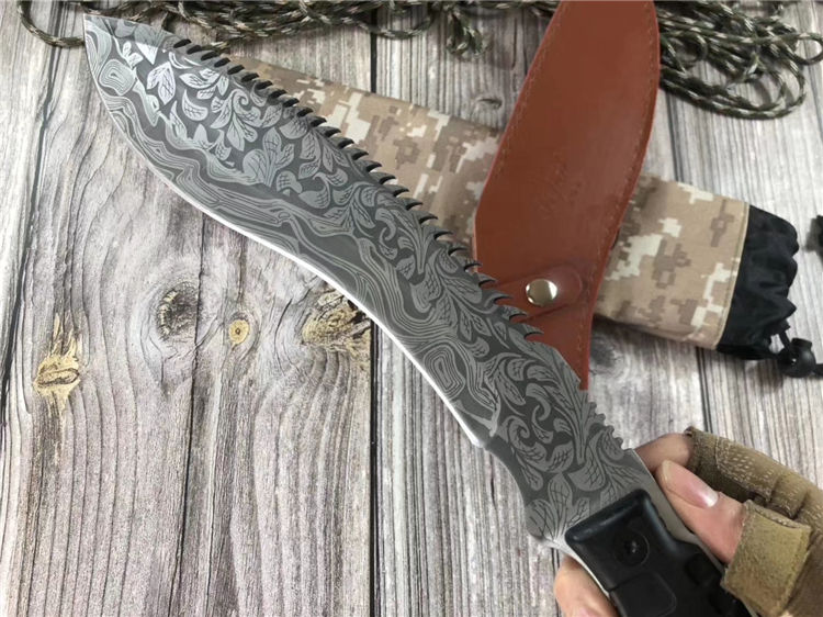 尼泊尔背齿巴雷特狗腿弯刀 全长:39.5cm 刀刃:26.1cm 刃厚:0.6cm 刃宽:5.3CM 柄长:12.5cm 柄材:橡胶 硬度:58HRC 毛重:926克(含皮套) 表面处理:纯手工锻造 结构:龙骨结构,刀身贯穿刀柄,非常牢固 、皮鞘、纸盒