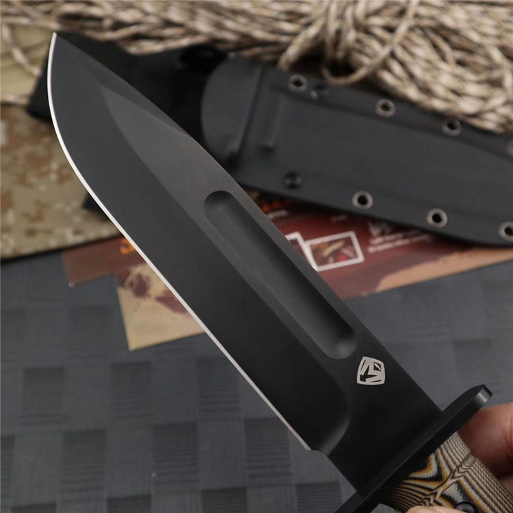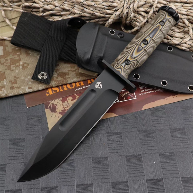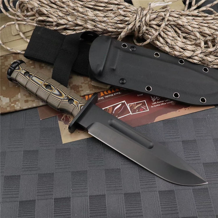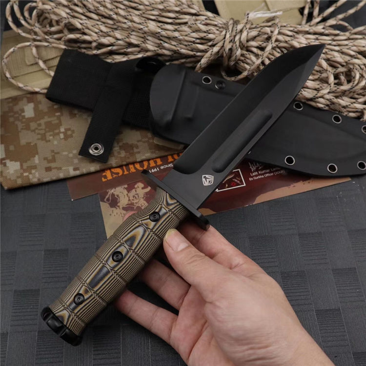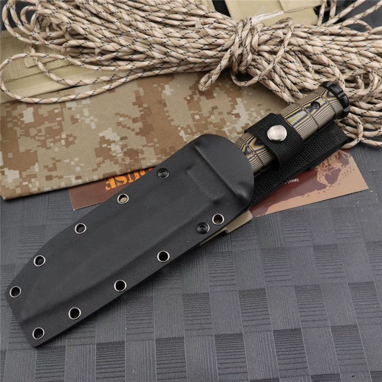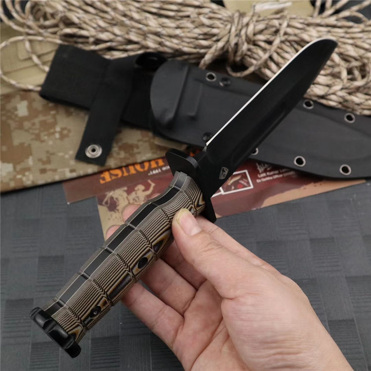 梅德福德美国战斗机直刀 全长:30.4CM 刃长:15.2CM 刃厚:0.58CM 柄长:12.2CM 硬度:62HRC,真空处理 刃材:DC53钢 柄材:黑棕沙G10 附件:战术刀鞘 重量:780公克