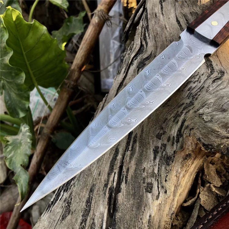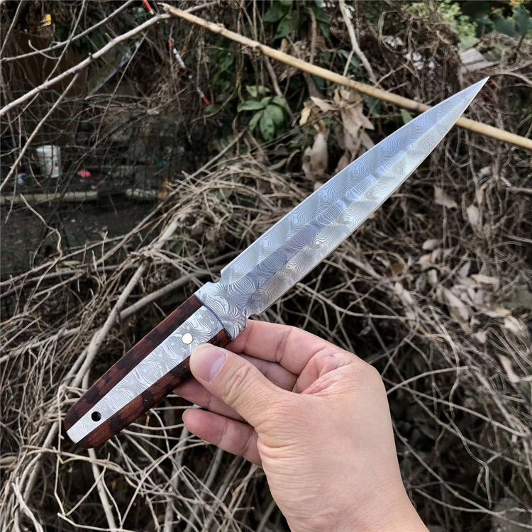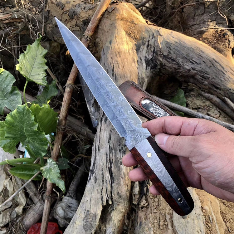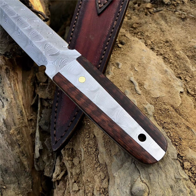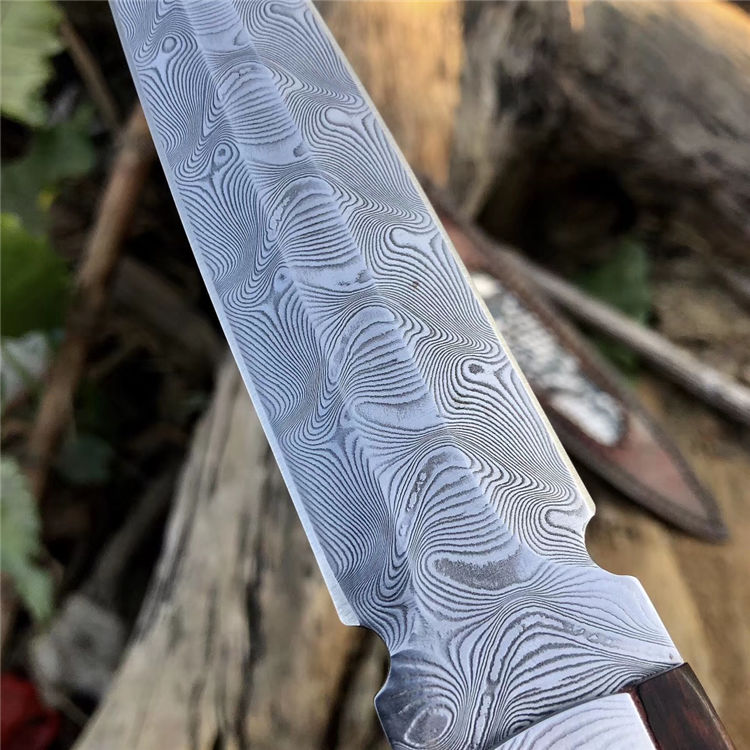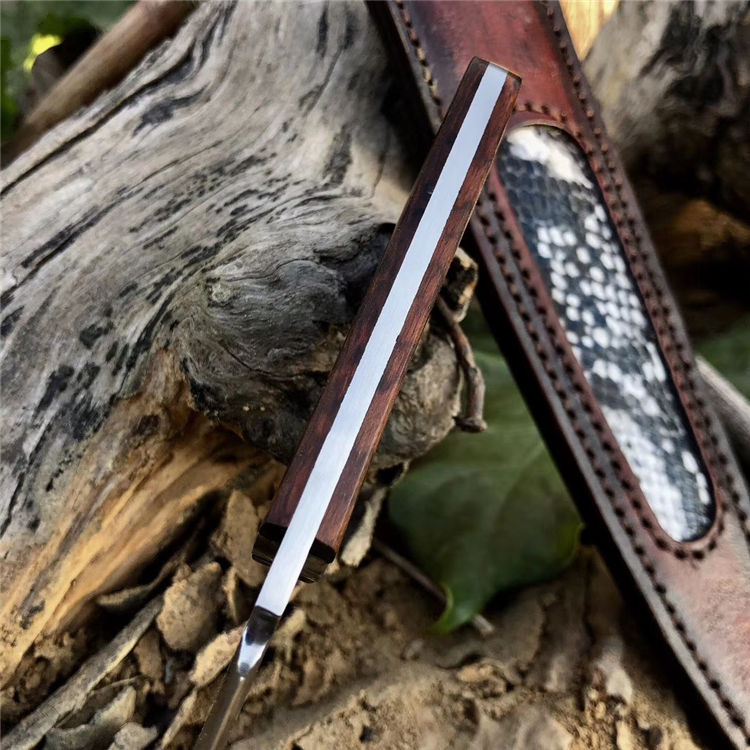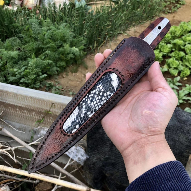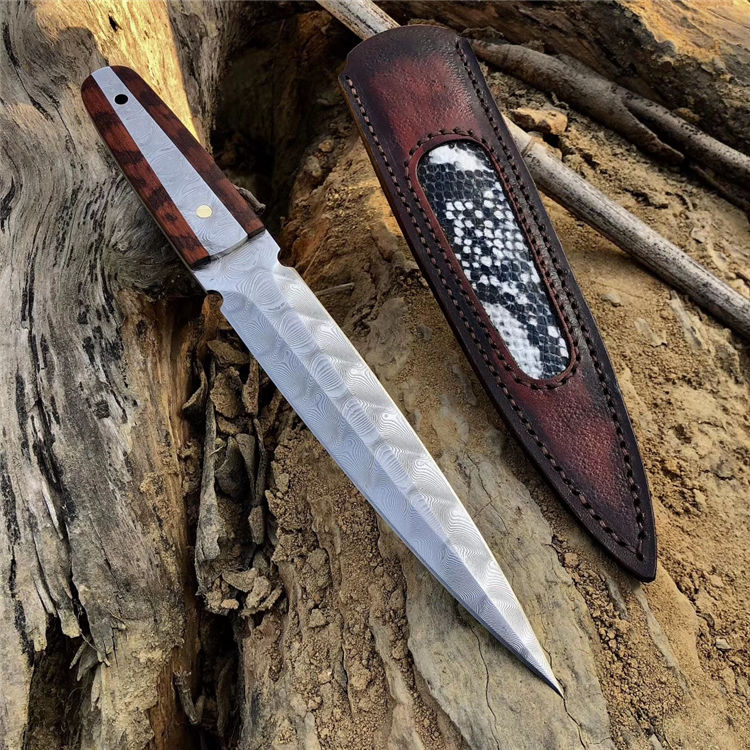 大马士革眼镜蛇直刀 全长:27.8cm 刃长:17cm 柄长:9.5cm 刃厚:0.35cm 刃材: VG10无心大马士革 热处理: 真空深冷热处理 硬度:60HRC 柄材:蛇纹木+大马士革 净重:278g 毛重:385g 配:手工高档皮套