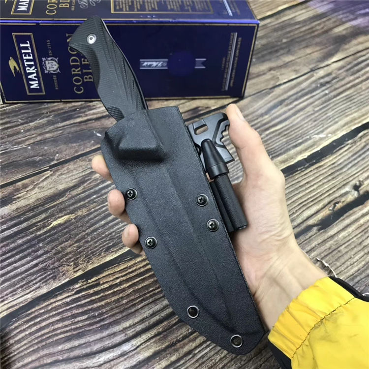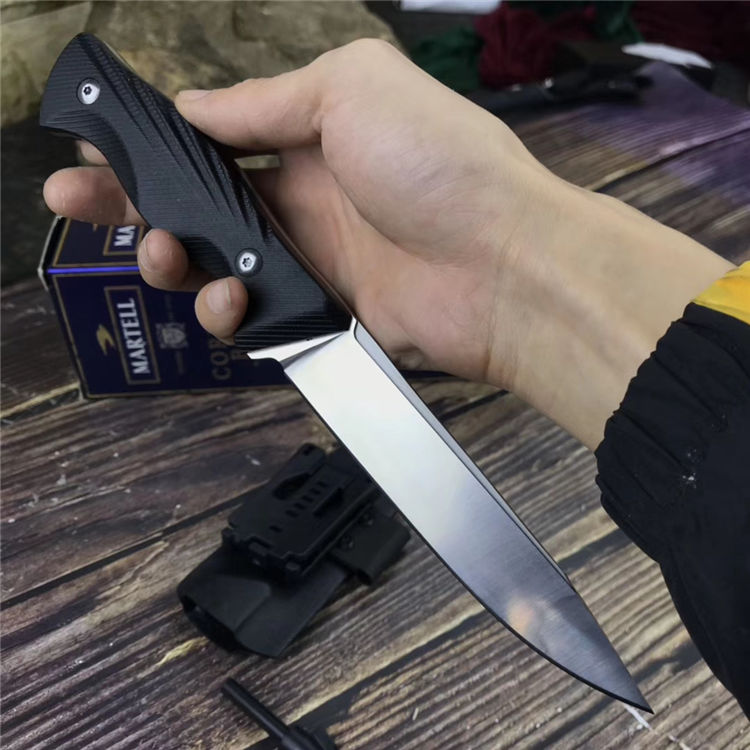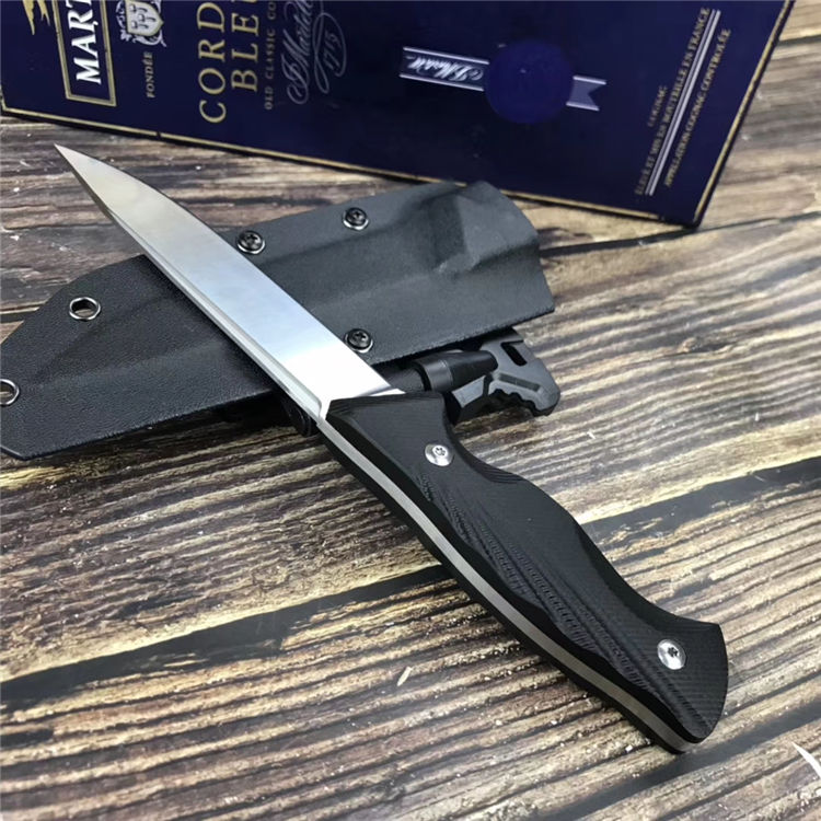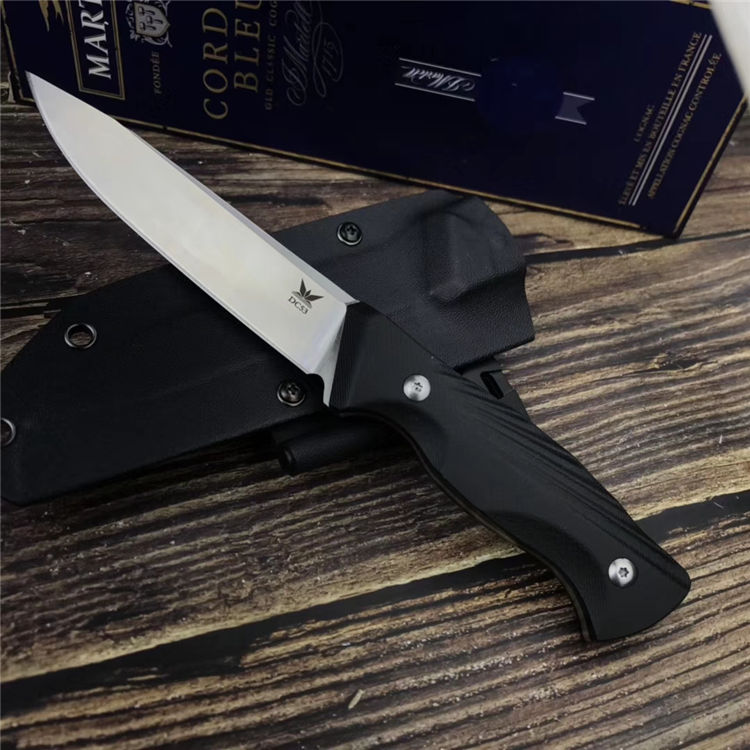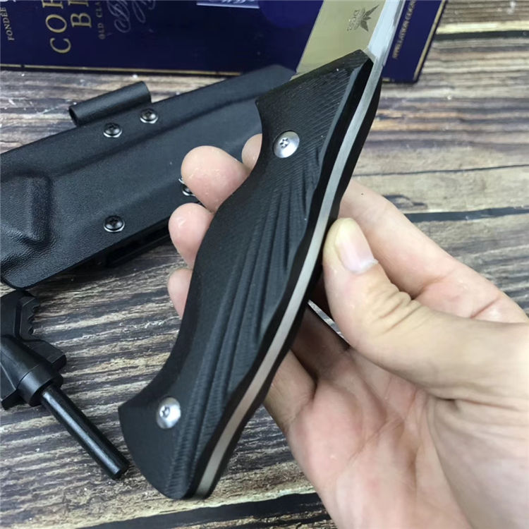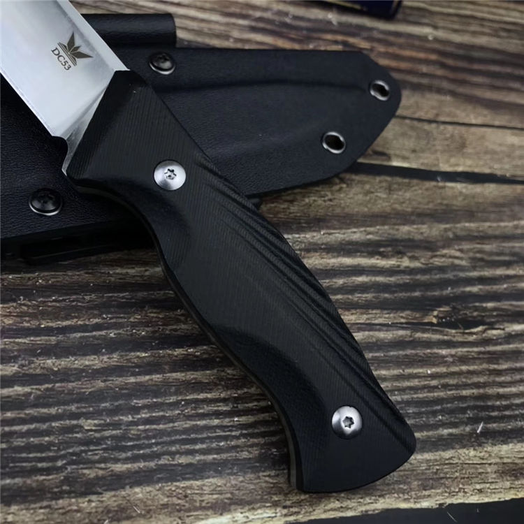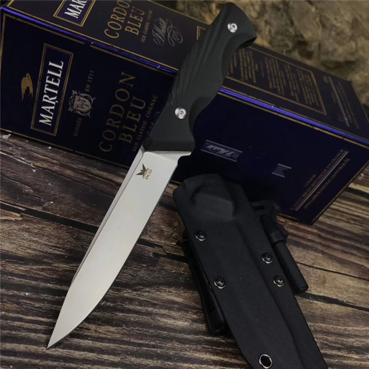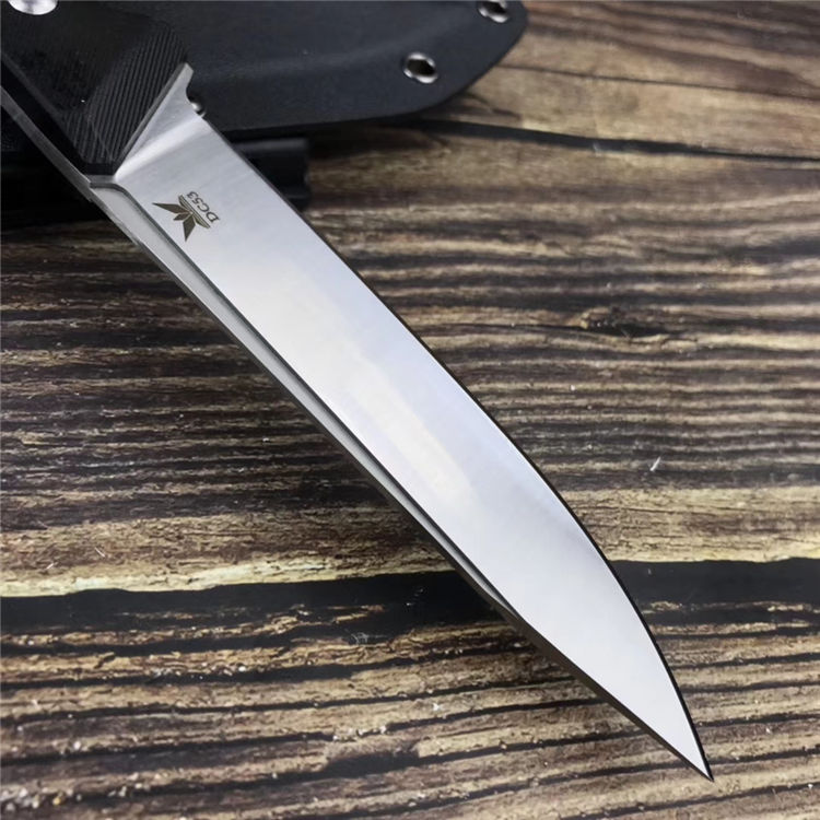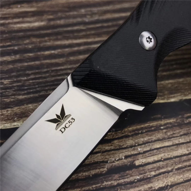 二次元直刀 刃材:DC53钢 柄材:G10 制作:刃口锋利 总长:245MM 刃长:130MM 刃厚:5MM 刃宽:27MM 硬度:58HRC 热处理技术:真空热处理 开刃方式:水冷二次开刃,以锋利度为主 刀套:K鞘