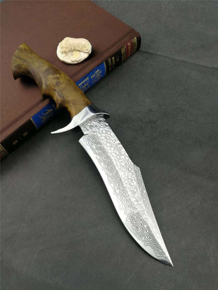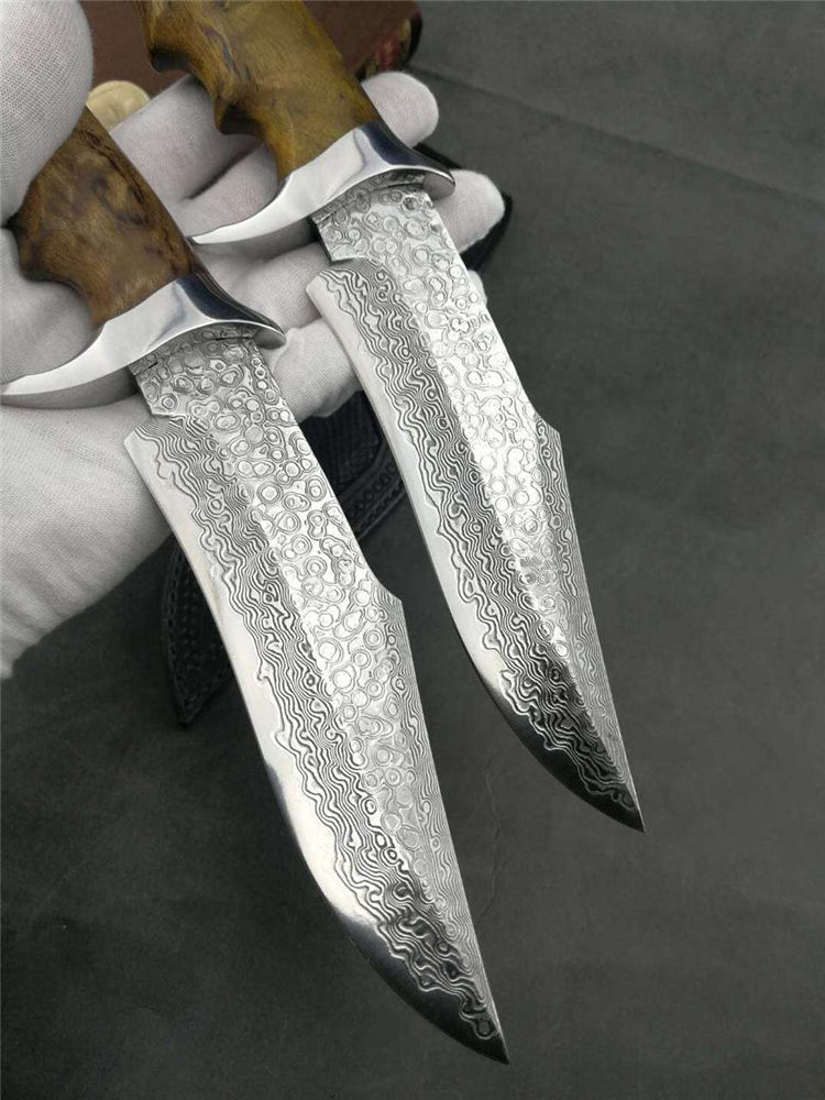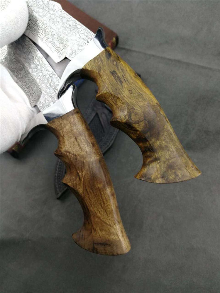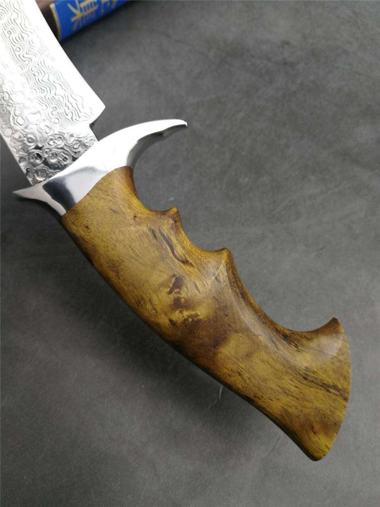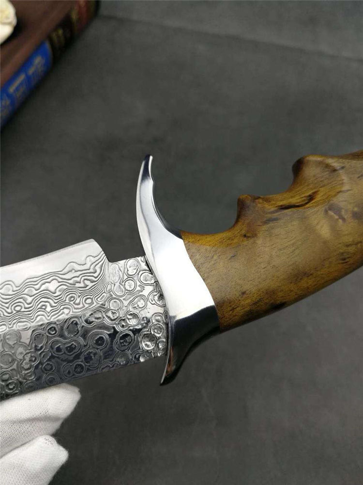 大马士革巨鲨直刀 总长:27cm 刃长:14.5cm 柄长:12.5cm 厚度:4.5MM 宽度:4.0cm 刃材:锻造雨点纹大马士革钢 硬度:60-61HRC 柄材:不锈钢大护手+进口香檀木 包装:手工缝线镶嵌皮艺刀鞘,原厂出口手工盒 开刃方式:三次开刃,粗磨刀刃-冷水手工开刃-细磨,锋利度大大提高 专业真空深冷热热处理,以及回火处理,保证足够整刀硬度稳定