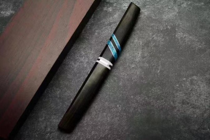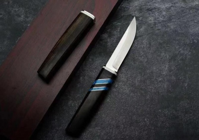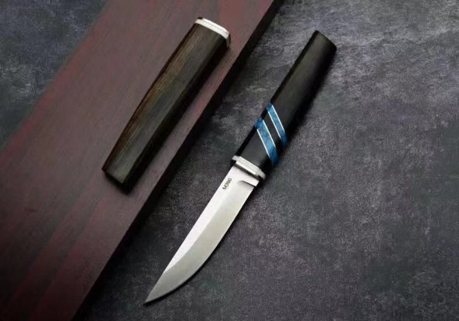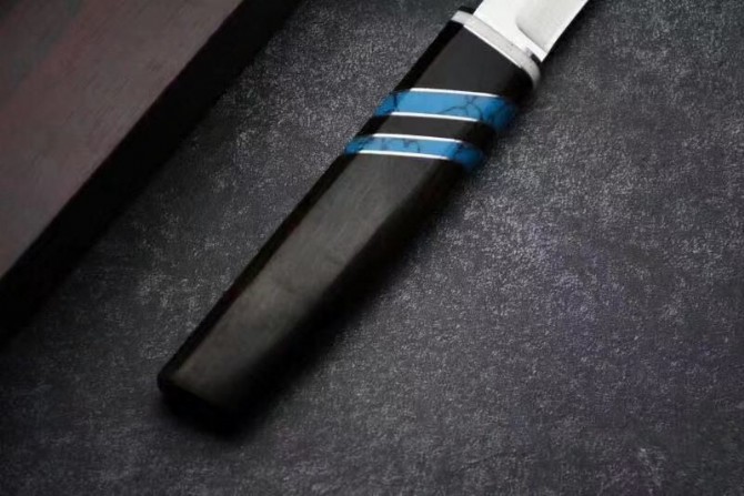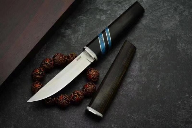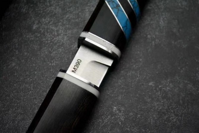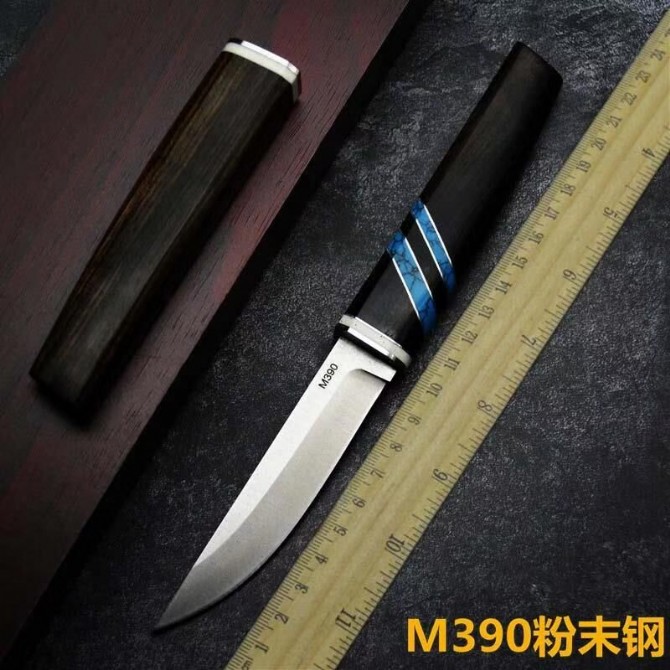 M390吉野小武士 总长:22.5cm 刃长:10.5cm 手柄:11cm 厚度:0.36cm 刃宽:2cm 钢材:进口M390粉末神钢 热处理:真空深冷热处理 硬度:62-63HRC, 柄刀鞘材料:黑檀木+松石+象牙 包装:黑色手工小盒