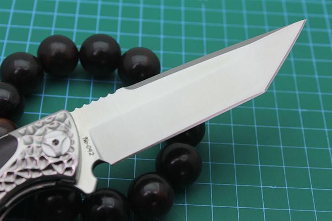 M390极度寒冰折刀 总长:22.7cm 刃长:9.7cm 闭合长:12.5cm 钢材厚度:3.9mm 刃宽度:2.5cm 刃钢材:奥地利进口M390粉末钢 硬度:61HRC,(真空深冷热处理) 开刃方式:水冷二次开刃 表面效果;砂光 硬度:61HRC 手柄:TC4钛合金+进口缅甸小叶紫檀木材 包装:意大利植鞣皮纯手工雕花缝线制作皮套+盒子