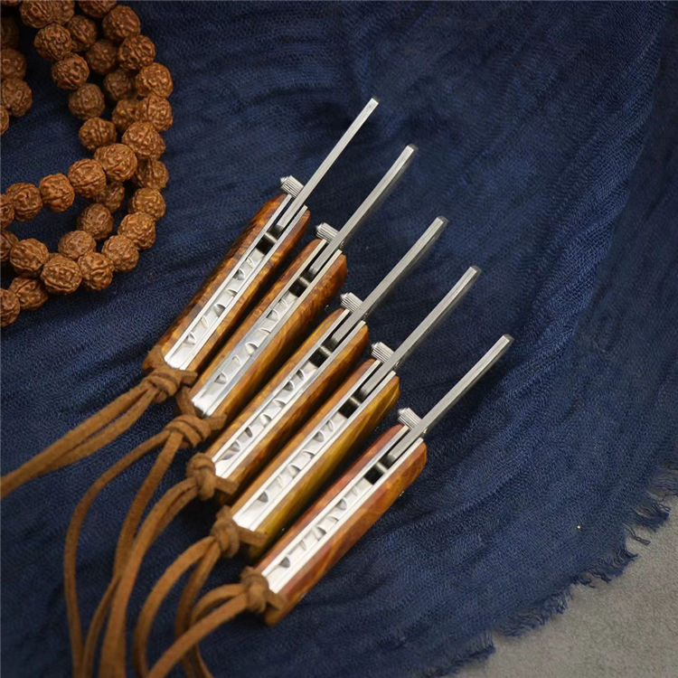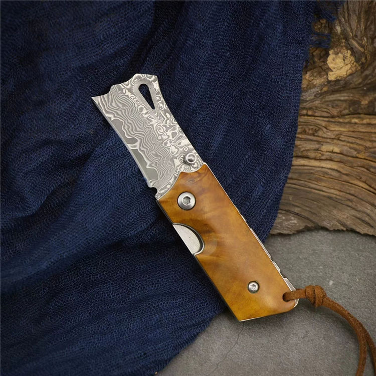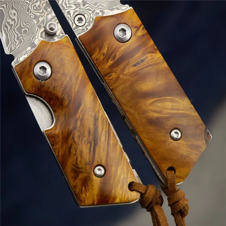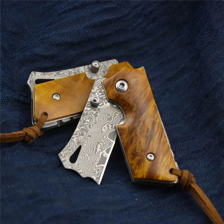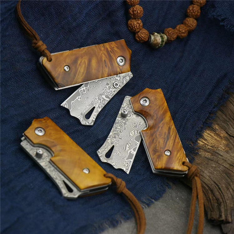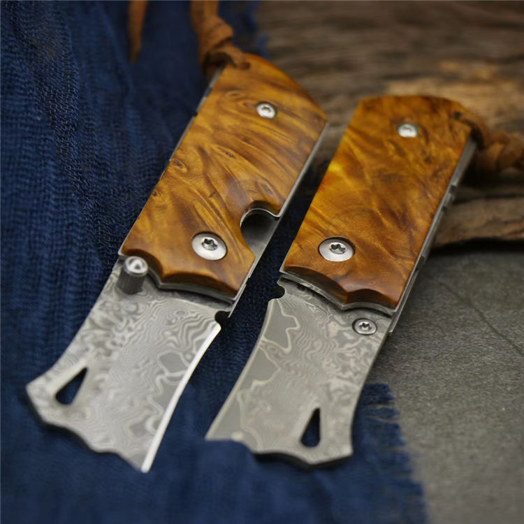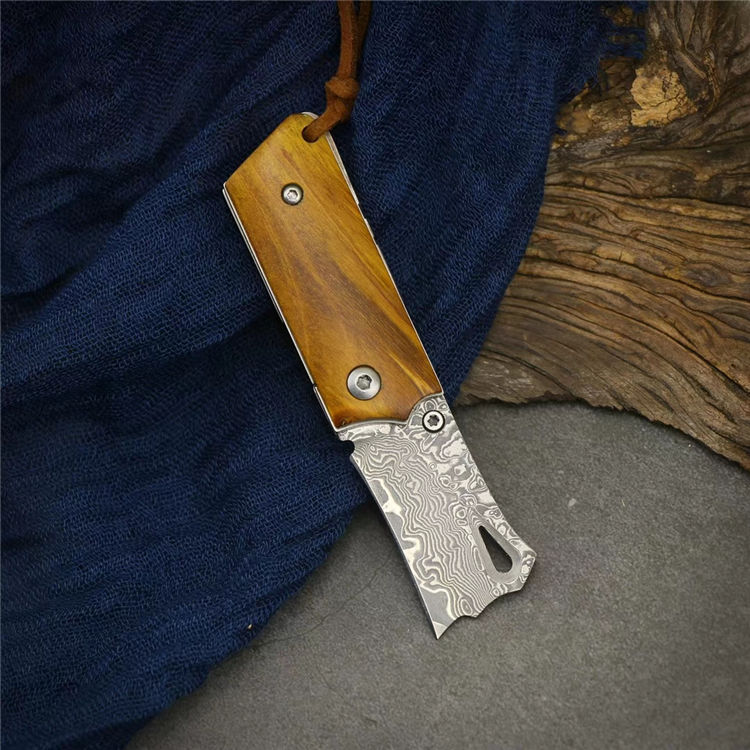 大马士革小魔丸折刀 总长:9.2cm 刃长:3.6cm 手柄:5.8cm 刃宽:2.1cm 刃厚:2MM 硬度:59-60HRC 钢材:进口锻造大马士革钢 柄材:进口稳定固化木 包装:黑色手工小盒
