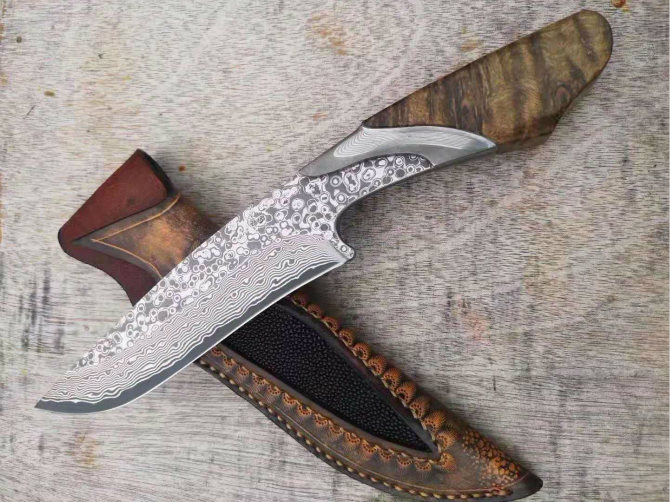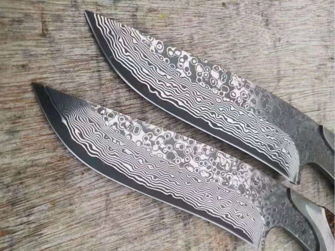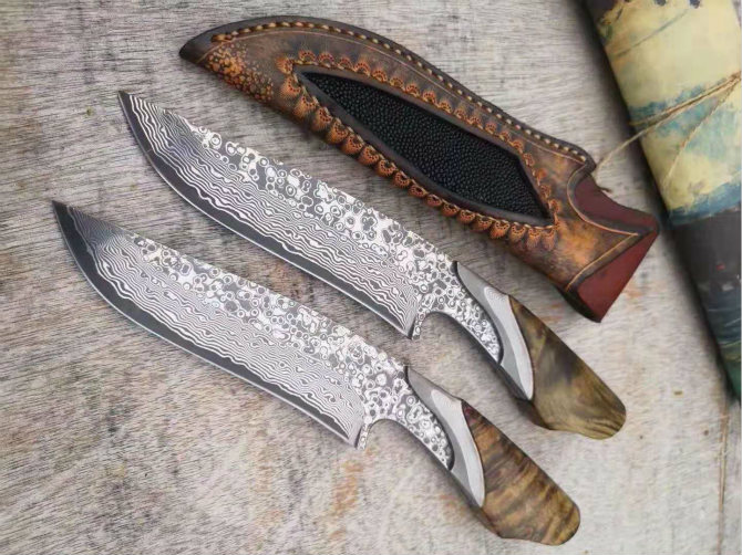大马士革巨蟒直刀 总长:25.8cm 刃长:14.5cm 柄长:10.5cm 刃厚:4.5MM 刃宽:4.0cm 刃材:锻造雨点纹大马士革钢 硬度:60-61HRC,专业真空深冷热热处理,以及回火处理,保证足够整刀硬度稳定 开刃方式:三次开刃,粗磨刀刃-冷水手工开刃-细磨,锋利度大大提高 柄材:一体大护手+进口香檀木 包装配件:手工缝线镶嵌皮艺刀鞘,原厂出口手工盒