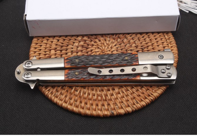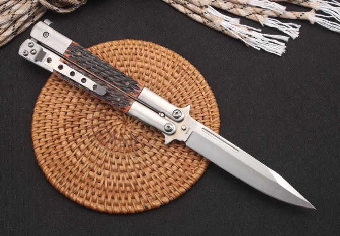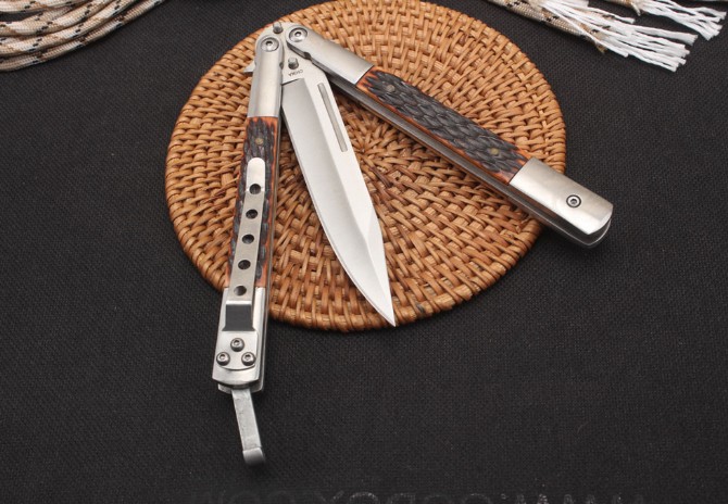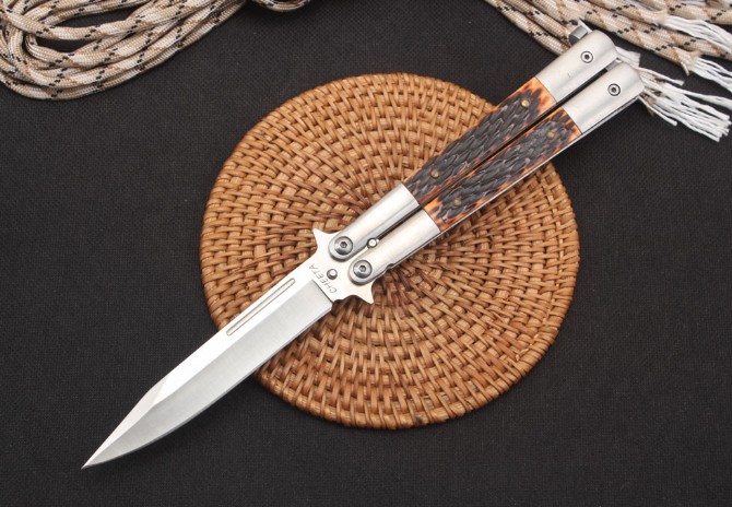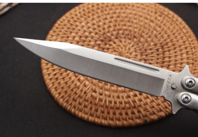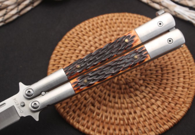 CHEETA鹿角甩刀 类型:蝴蝶甩刀 全长:22.5cm 刃长:10.1cm 柄长:12.2cm 刃宽:1.7cm 刃材:5Cr13MoV 柄材:钢柄+仿鹿角 硬度:56HRC 重量:142克 表面处理:沙光 锁型:甩刀