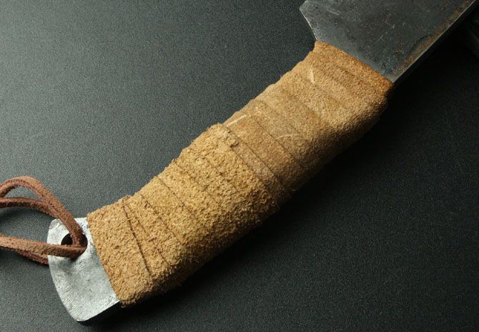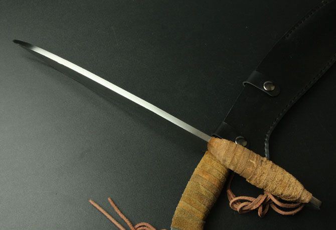 全 长:43cm 刃 长:24cm 柄 长:13cm 刃 厚:7mm 刃 宽:5.5cm 净 重:810克 毛 重:880克(含包装物) 硬 度:60HRC 刃 材:碳钢 柄 材:扎皮 表面处理:钢本色