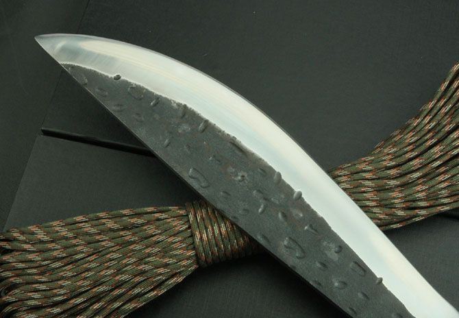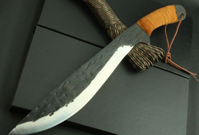 砍铁大弯刀(凸凹纹,平面纹) 全 长:50.5cm 刃 长:31cm 柄 长:13cm 刃 厚:7mm 刃 宽:6.5cm 净 重:1120克 毛 重:1300克(含包装物) 硬 度:58HRC 刃 材:碳钢 柄 材:扎皮 表面处理:电泳