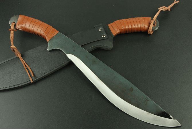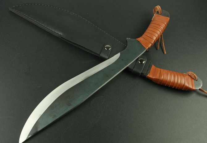 全 长:50.5cm 刃 长:31cm 柄 长:13cm 刃 厚:7mm 刃 宽:6.5cm 净 重:1120克 毛 重:1300克(含包装物) 硬 度:58HRC 刃 材:碳钢 柄 材:扎皮 表面处理:电泳
