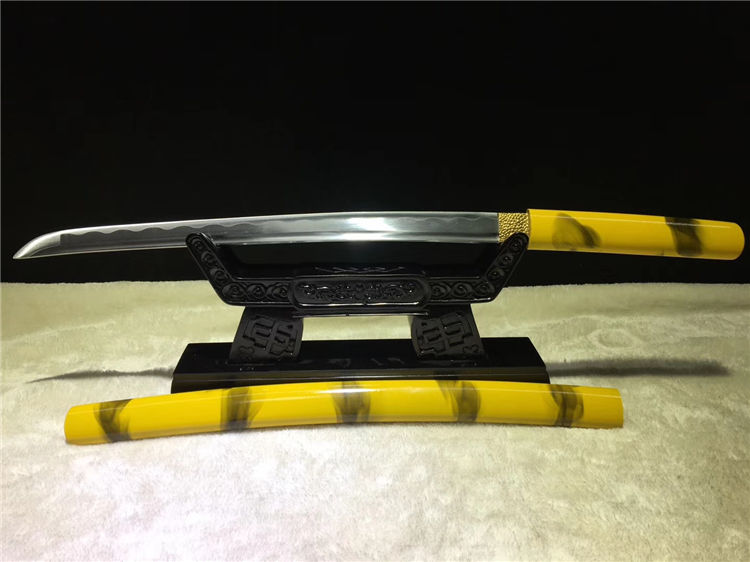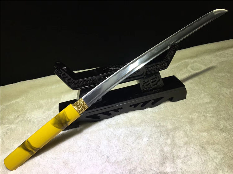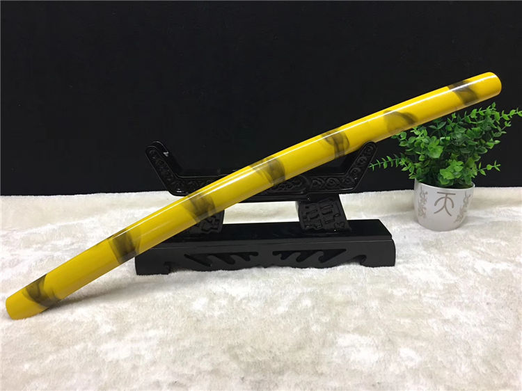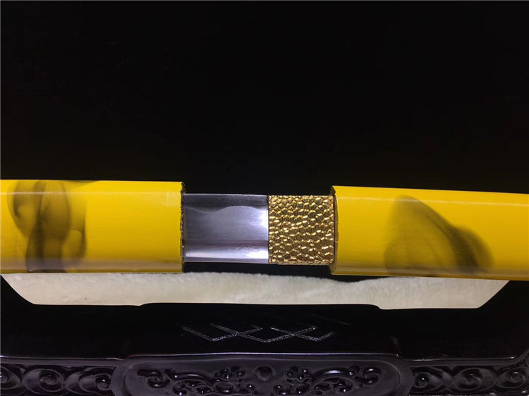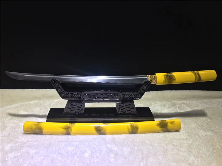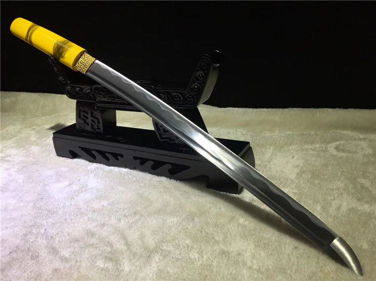 黄云唐刀 全长:76cm 刃长:52cm 柄长:21cm 刃宽:3.2cm 刃厚:0.70cm 全重:1.20Kg 净重:0.95Kg 材质:碳钢 鞘材:手工油漆 赠品:锦盒 刀油刀布 收藏,防身,乔迁送礼,武术健身,精美摆设